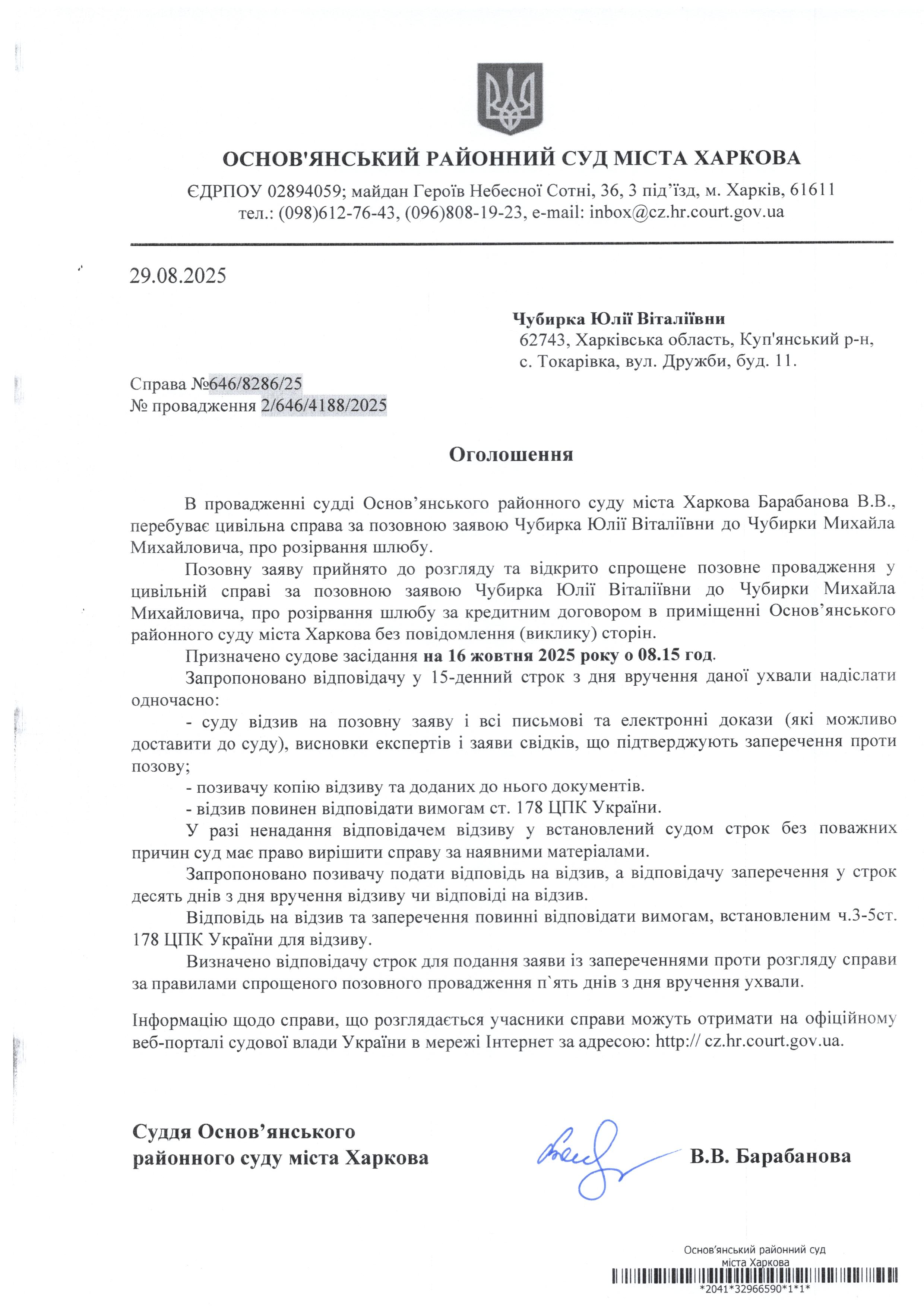 Оголошення по справі № 646/8286/25 для Чубирка Михайла Михайловича