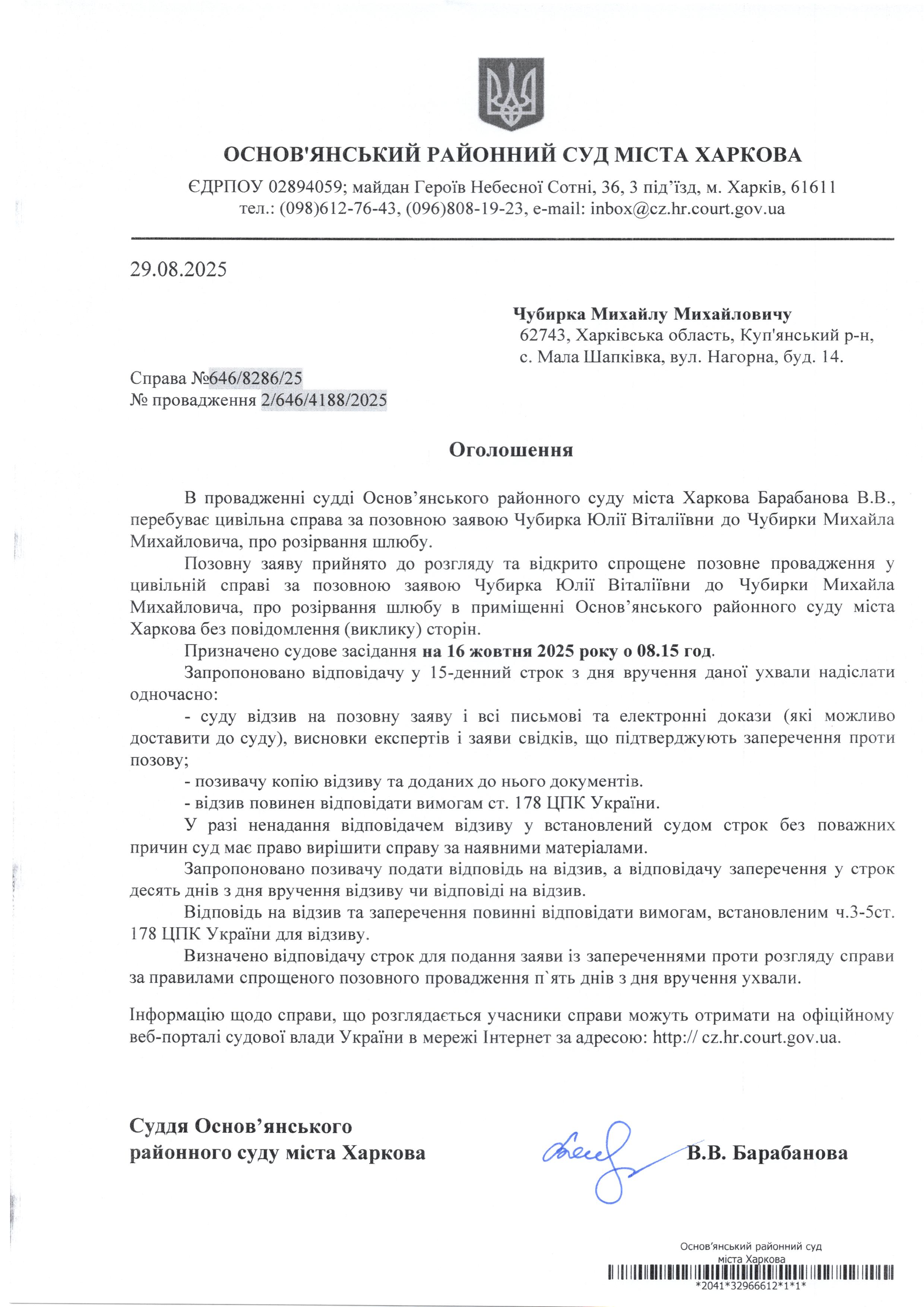Оголошення по справі № 646/8286/25 для Чубирка Юлії Віталіївни