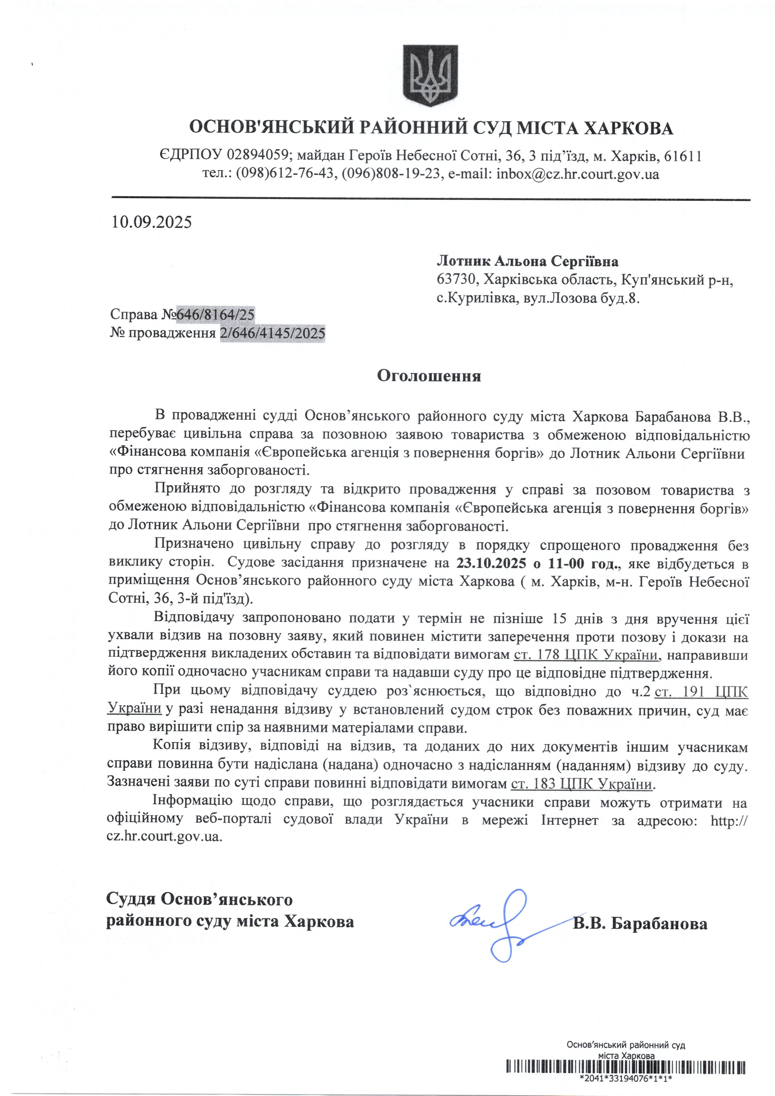 Оголошення по справі № 646/8164/25 для Лотник Альони Сергіївни