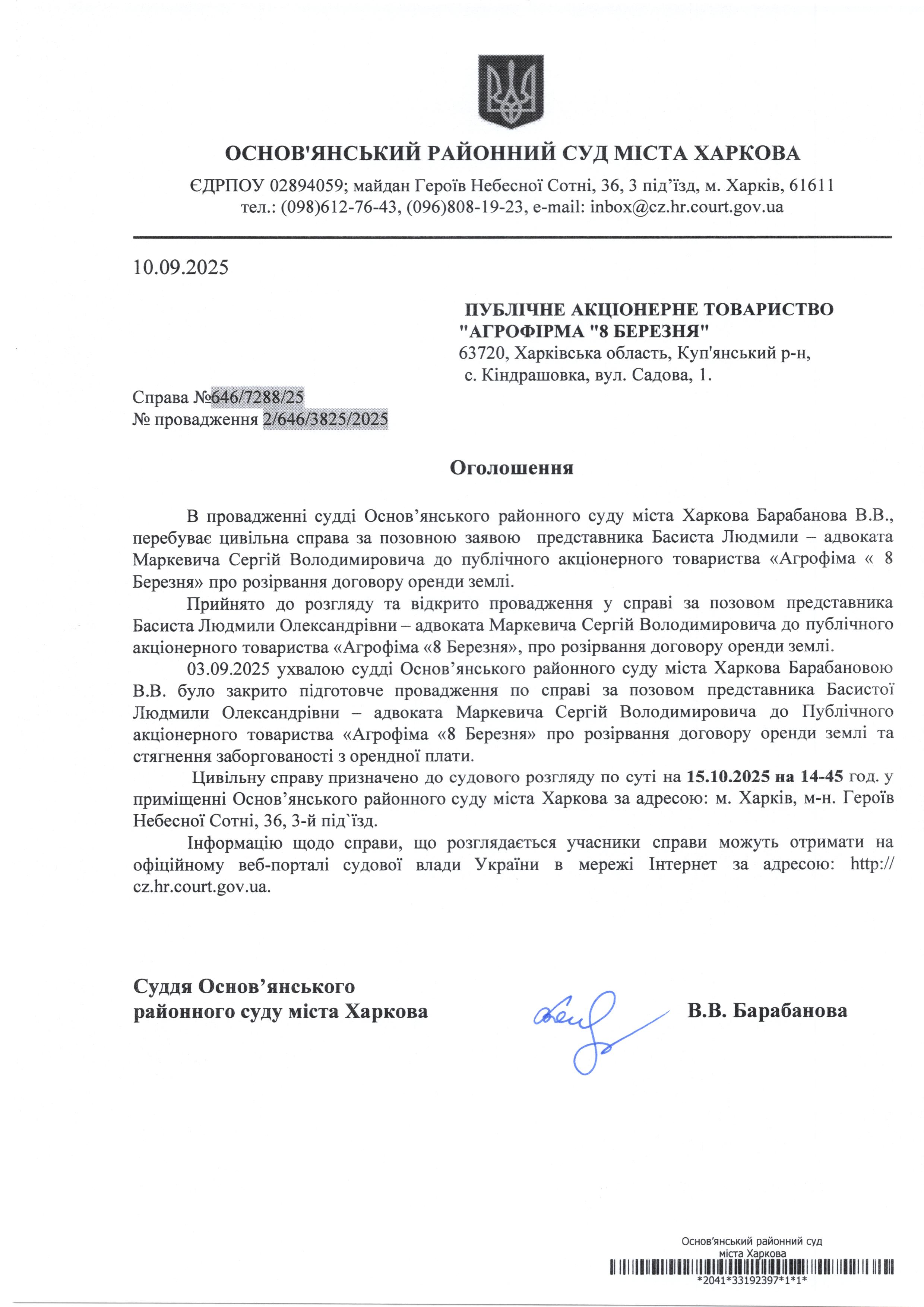 Оголошення по справі № 646/7288/25 для ПАТ "Агрофірма "8 березня"