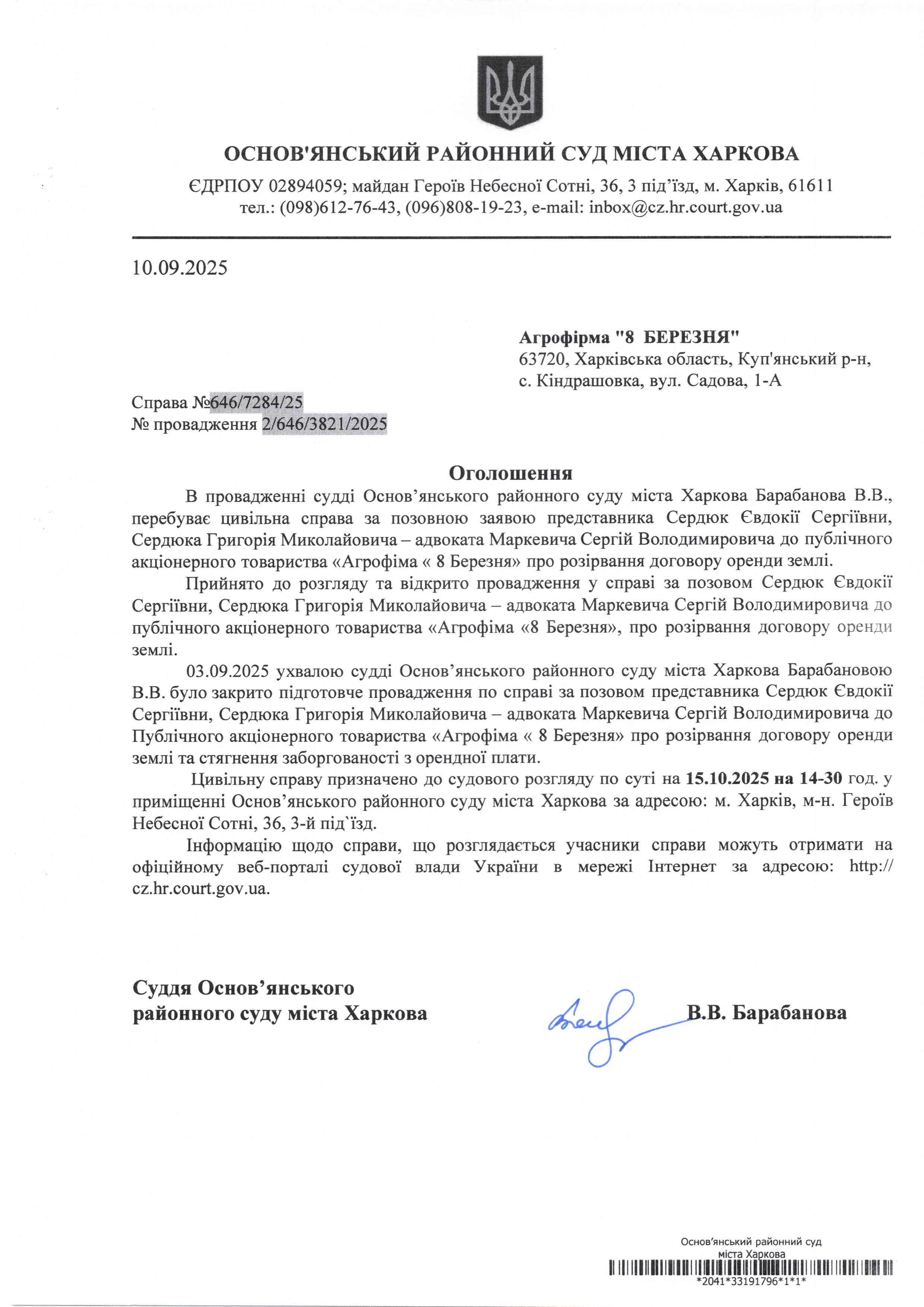 Оголошення по справі № 646/7284/25 для ПАТ "Агрофірма "8 березня"