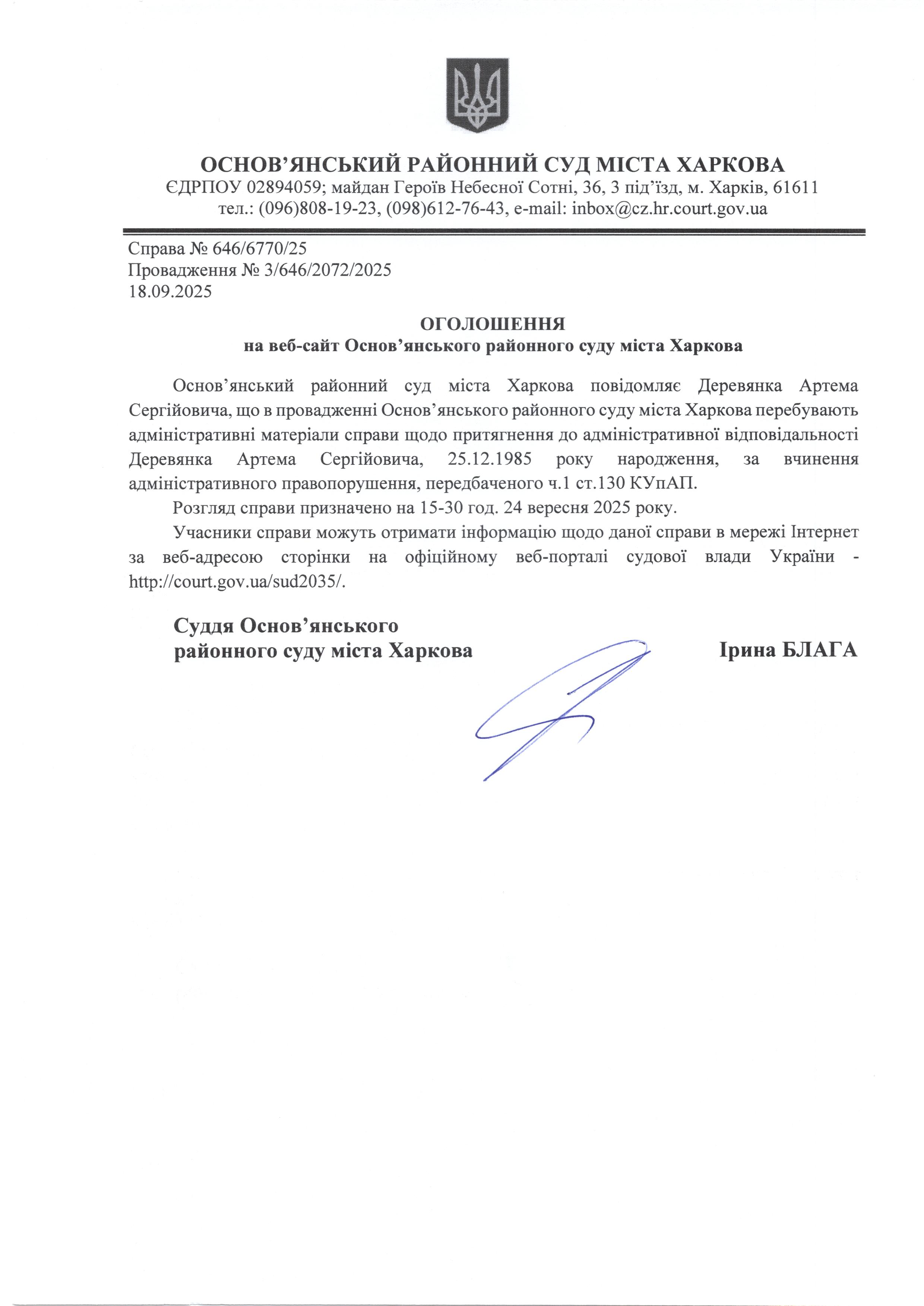 Оголошення по справі № 646/6770/25 для Деревянка Артема Сергійовича