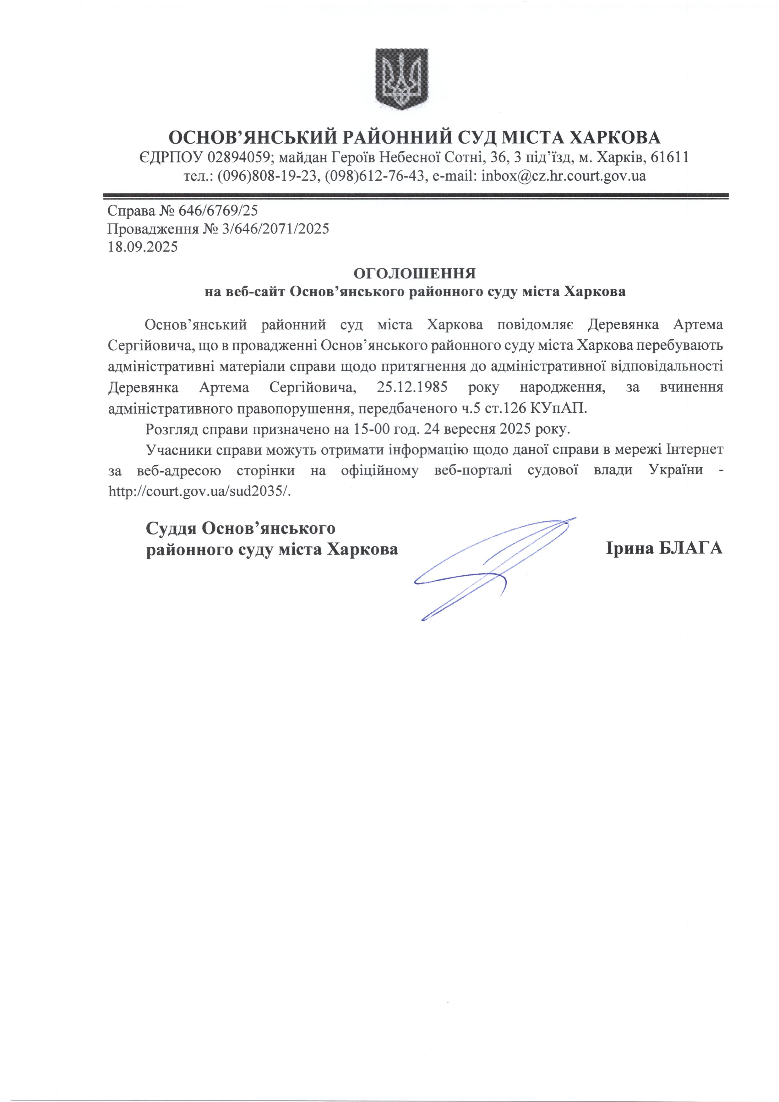 Оголошення по справі № 646/6769/25 для Деревянка Артема Сергійовича