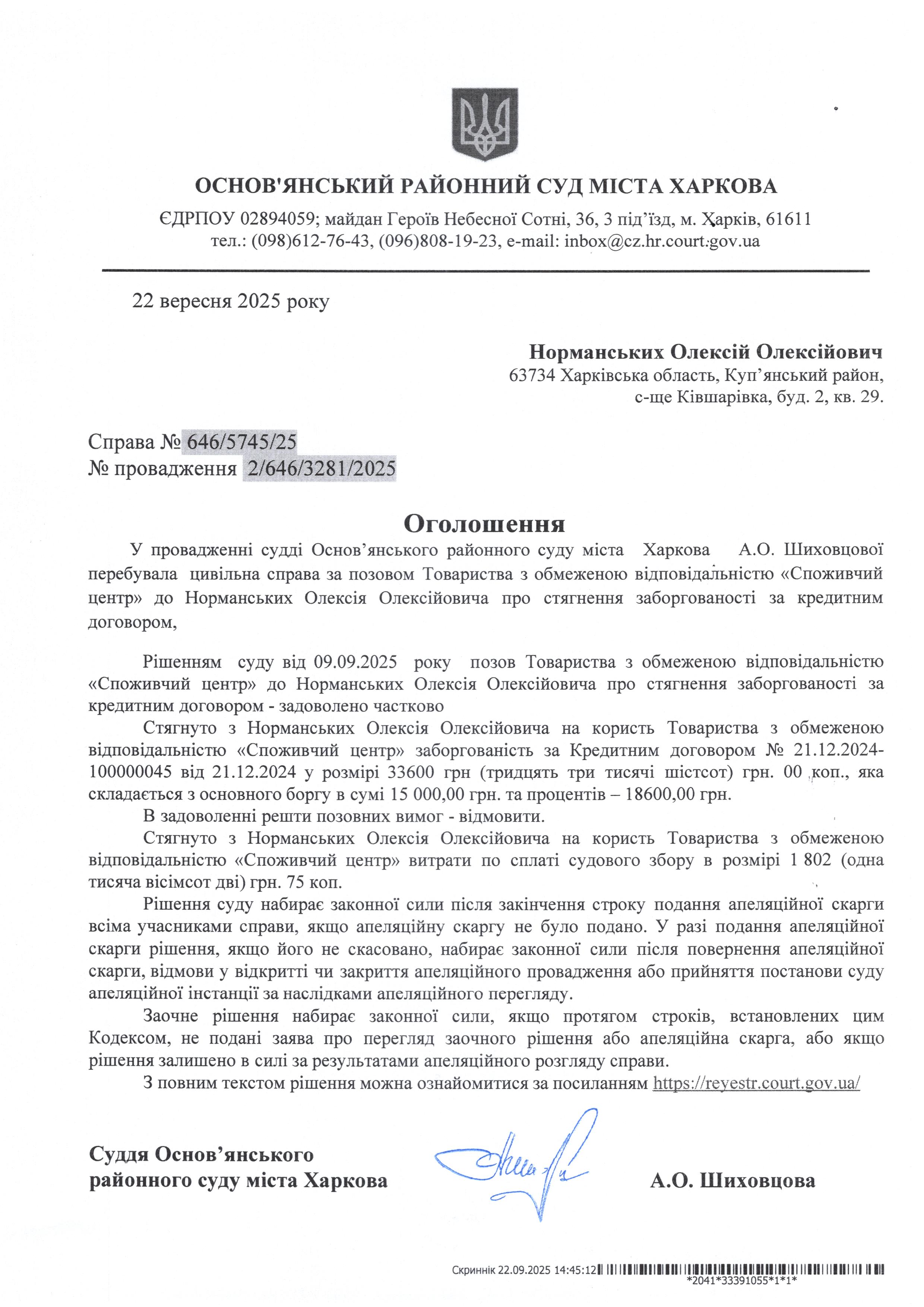 Оголошення по справі № 646/5745/25 для Норманських Олексія Олексійовича