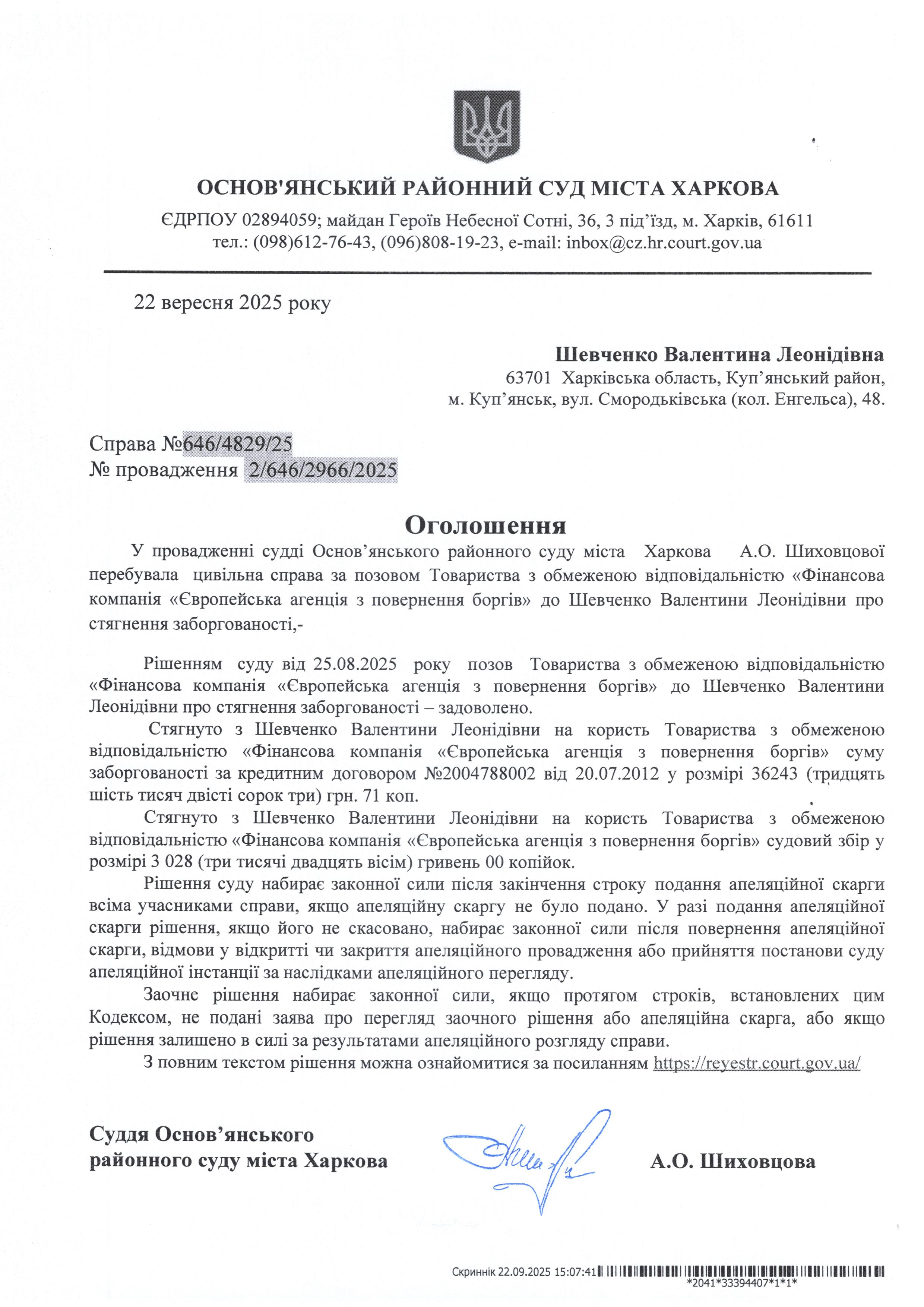 Оголошення по справі № 646/4829/25 для Шевченко Валентини Леонідівни