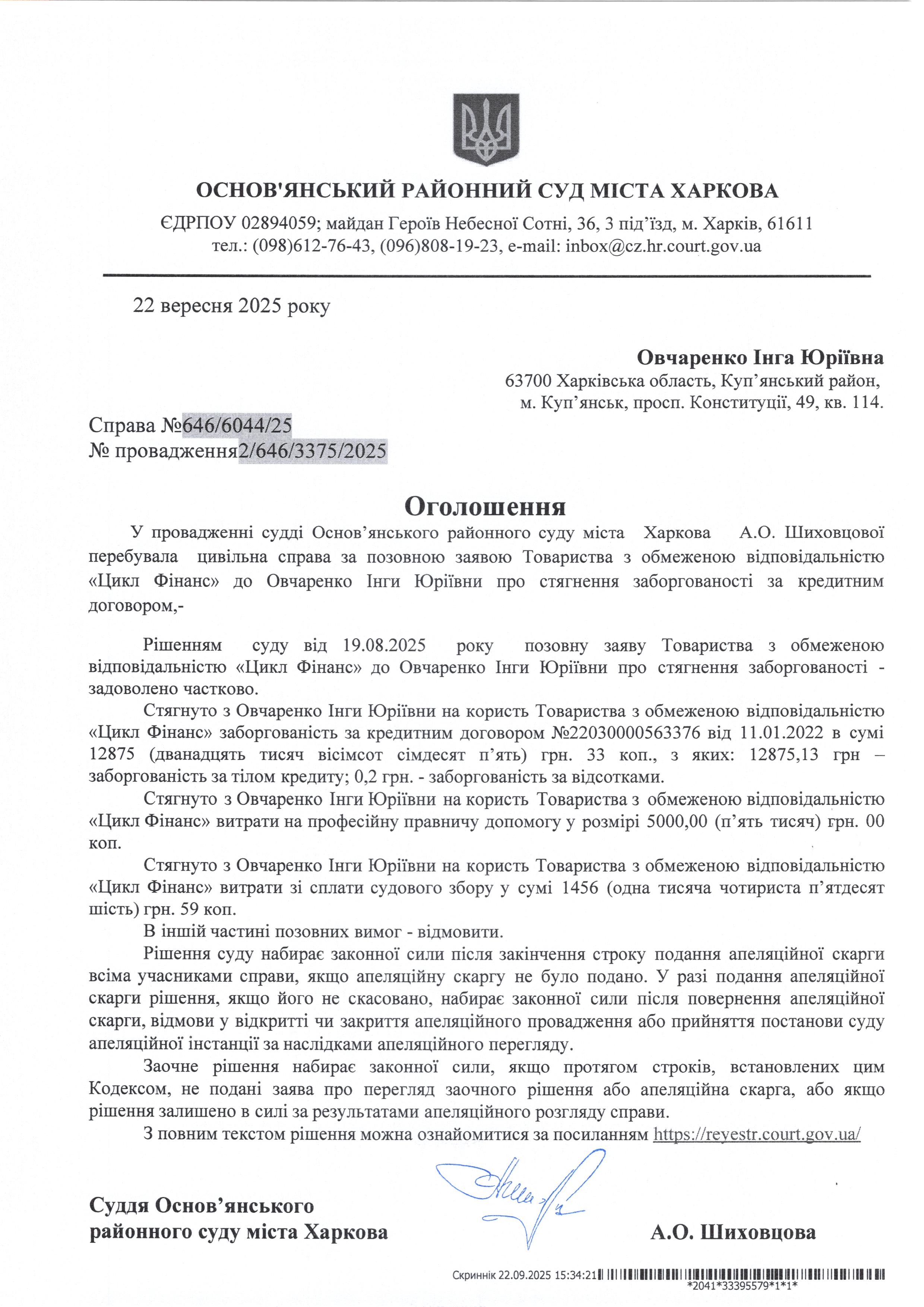 Оголошення по справі № 646/6044/25 для Овчаренко Інги Юріївни
