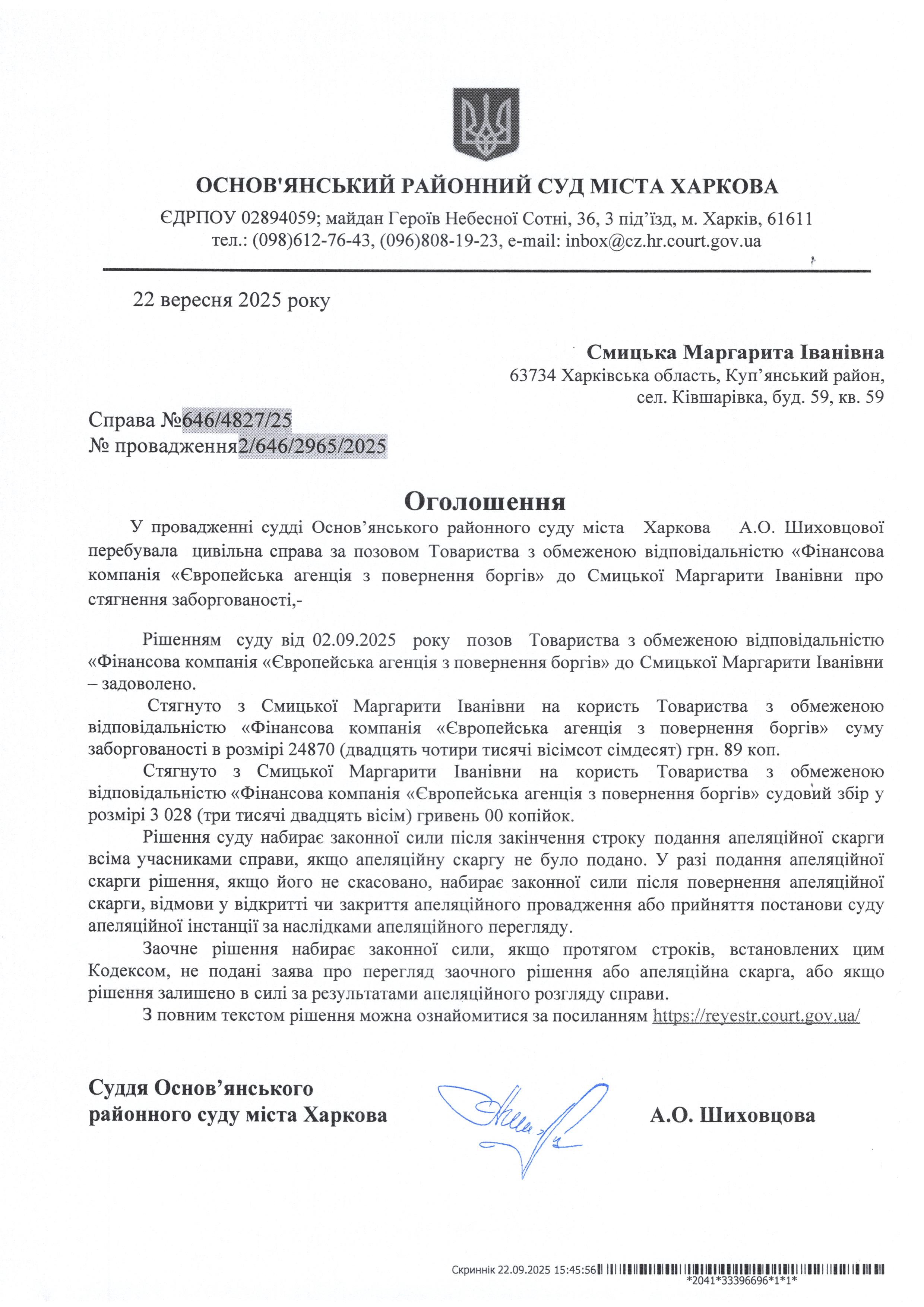 Оголошення по справі № 646/4827/25 для Смицької Маргарити Іванівни