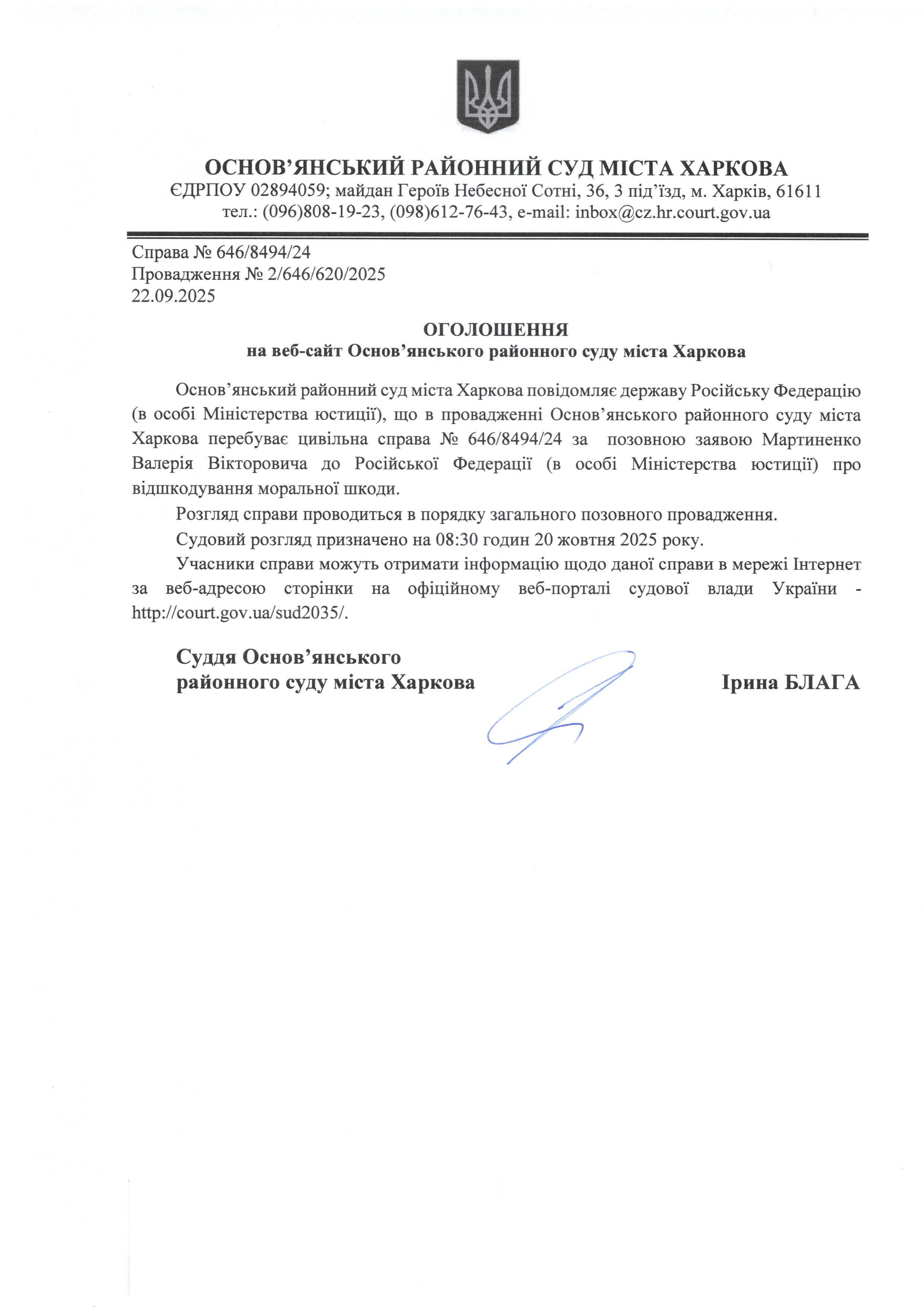 Оголошення по справі № 646/8494/24 для держави рф
