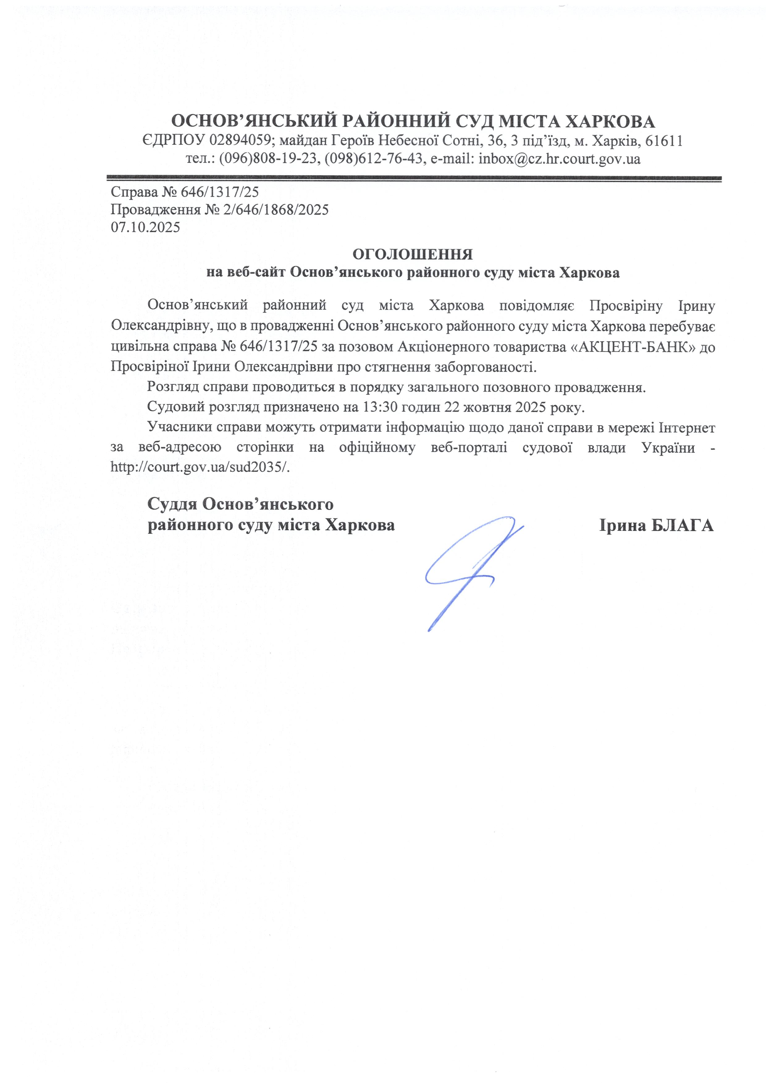 Оголошення по справі № 646/1317/25 для Просвіріної Ірини Олександрівни