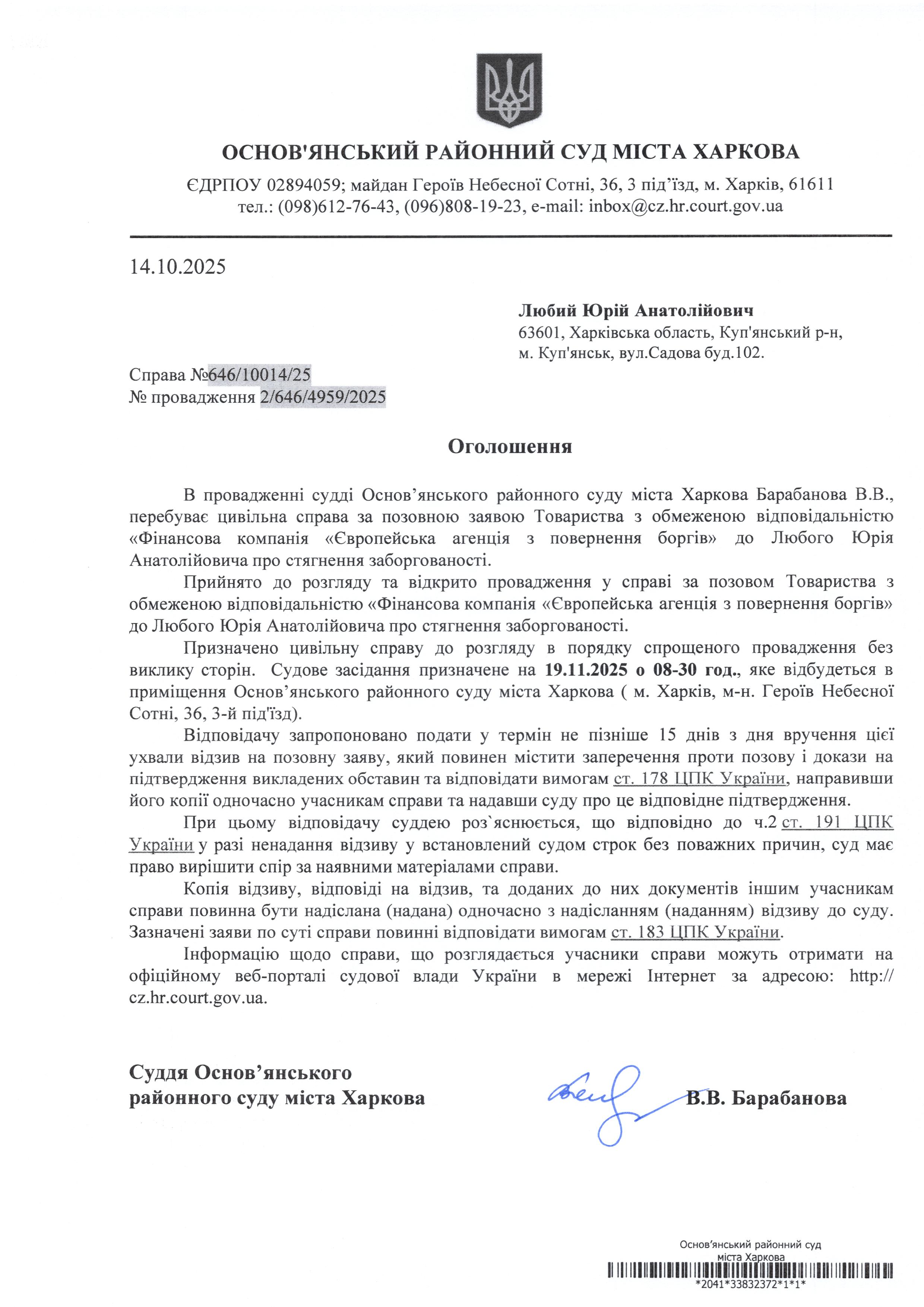 Оголошення по справі № 646/10014/25 для Любого Юрія Анатолійовича