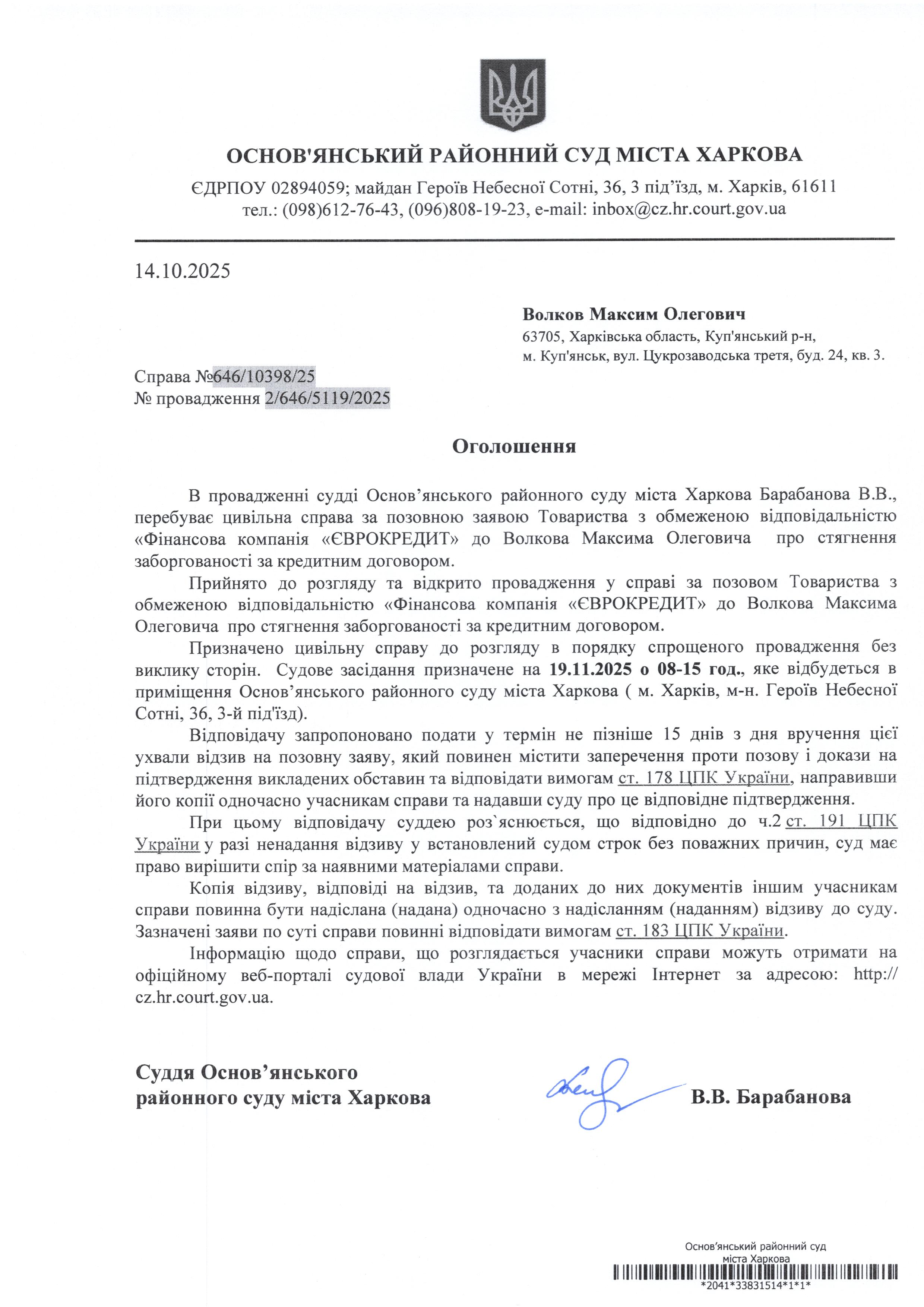 Оголошення по справі № 646/10398/25 для Волкова Максима Олеговича