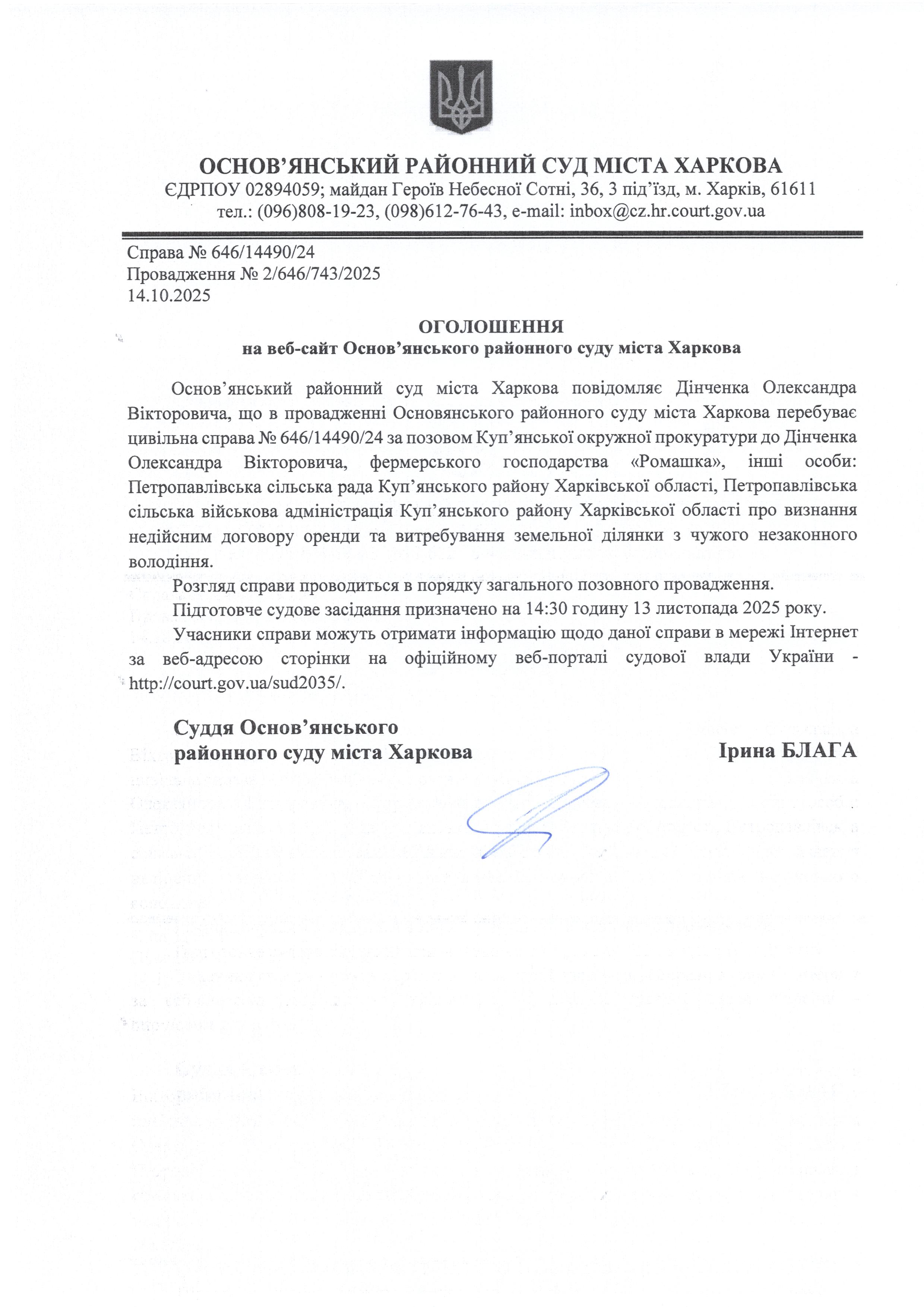Оголошення по справі № 646/14490/24 для Дінченка Олександра Вікторовича