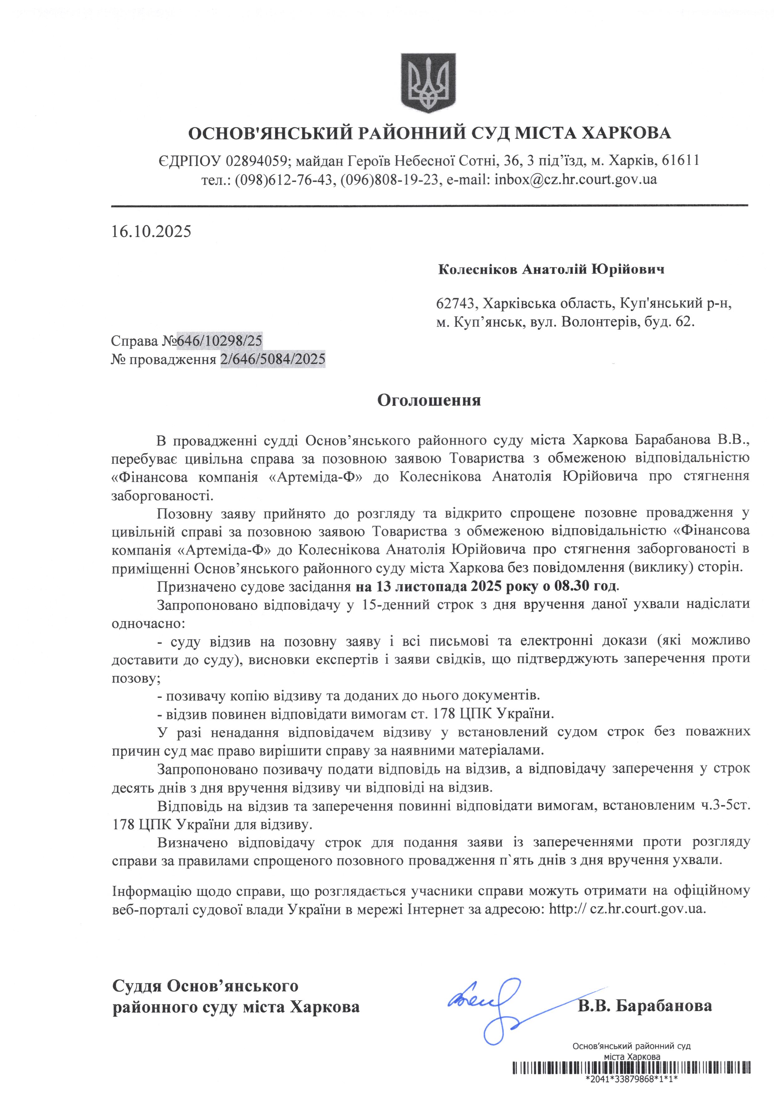 Оголошення по справі № 646/10298/25 для Колеснікова Анатолія Юрійовича