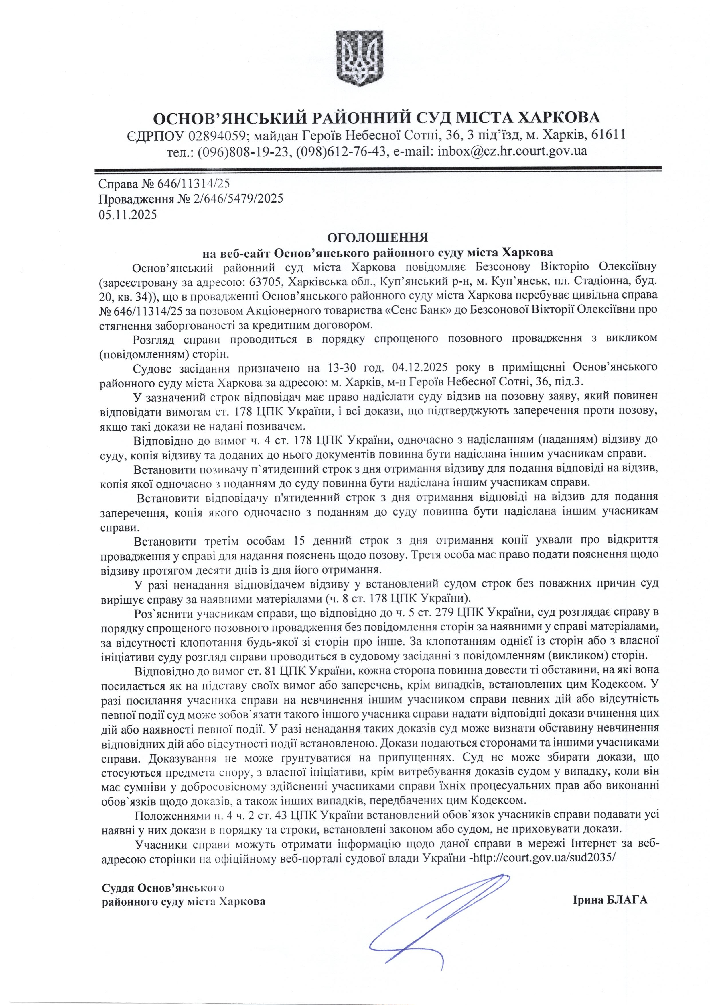 Оголошення по справі № 646/11314/25 для Безсонової Вікторії Олексіївни