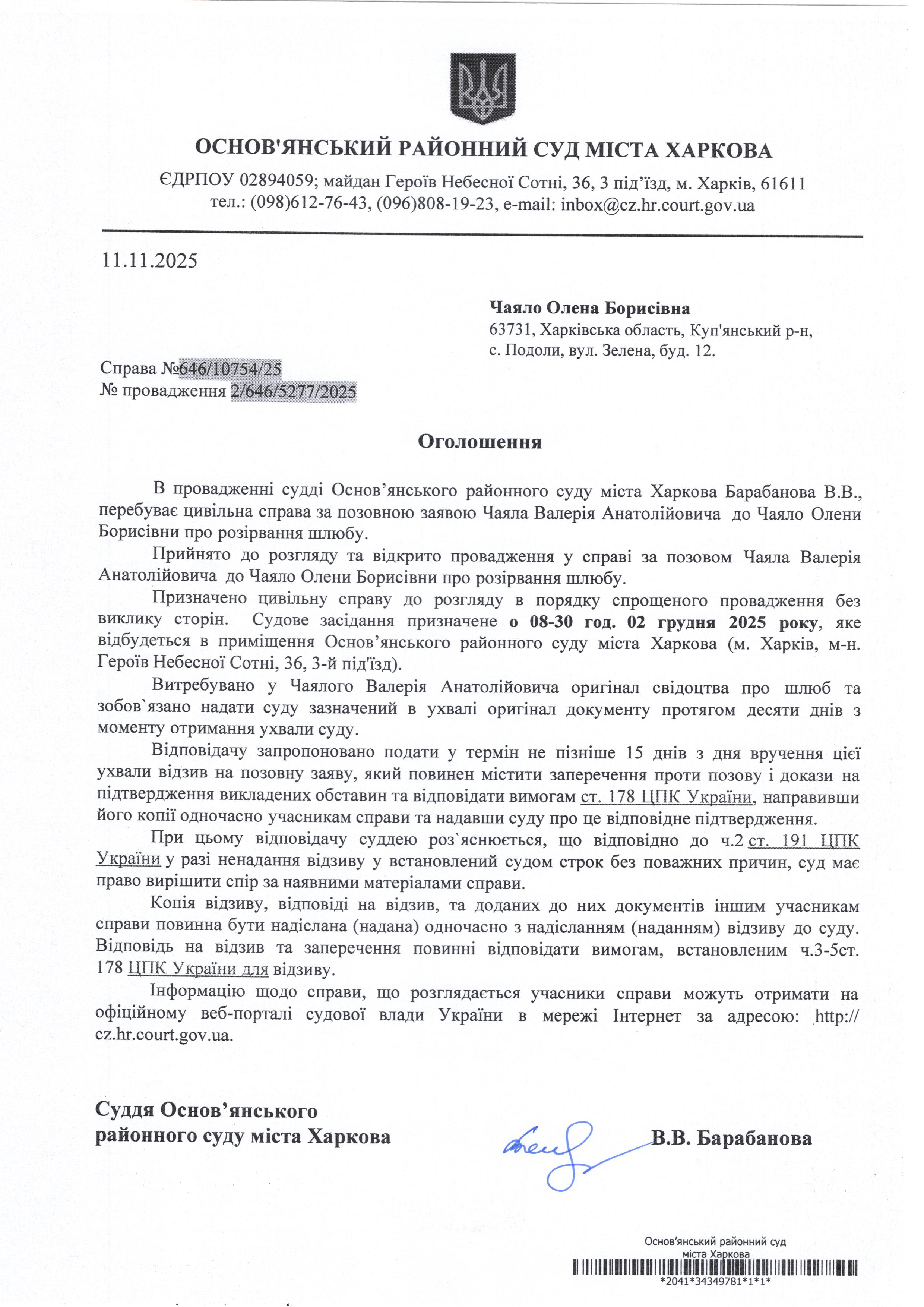 Оголошення по справі № 646/10754/25 для Чаяло Олени Борисівни