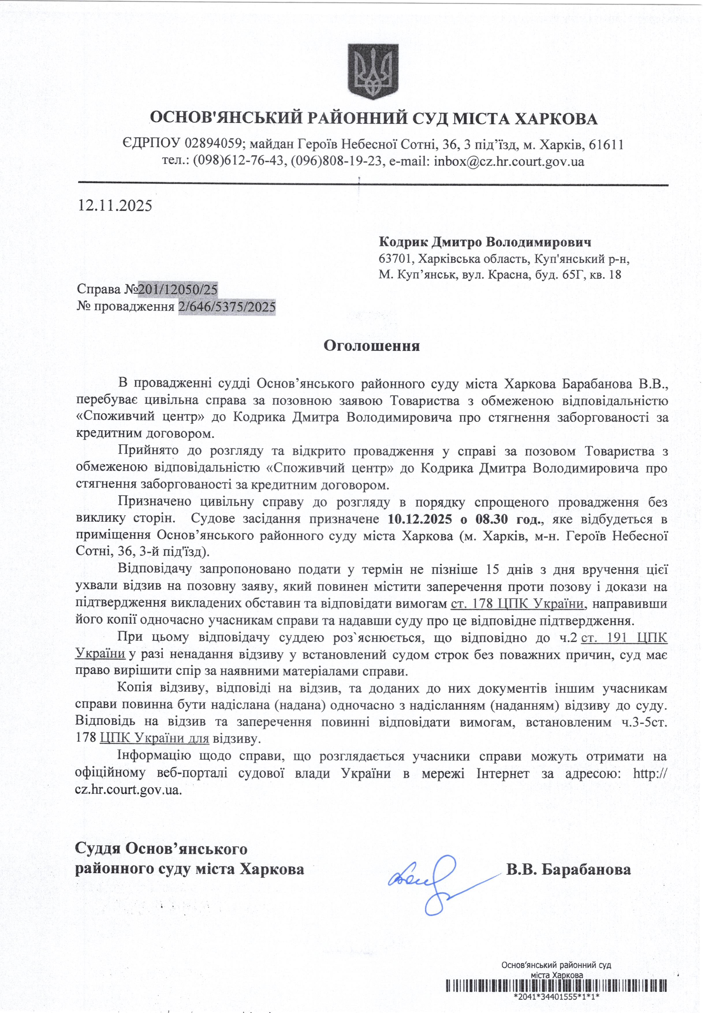 Оголошення по справі № 201/12050/25 для Кодрик Дмитра Володимировича