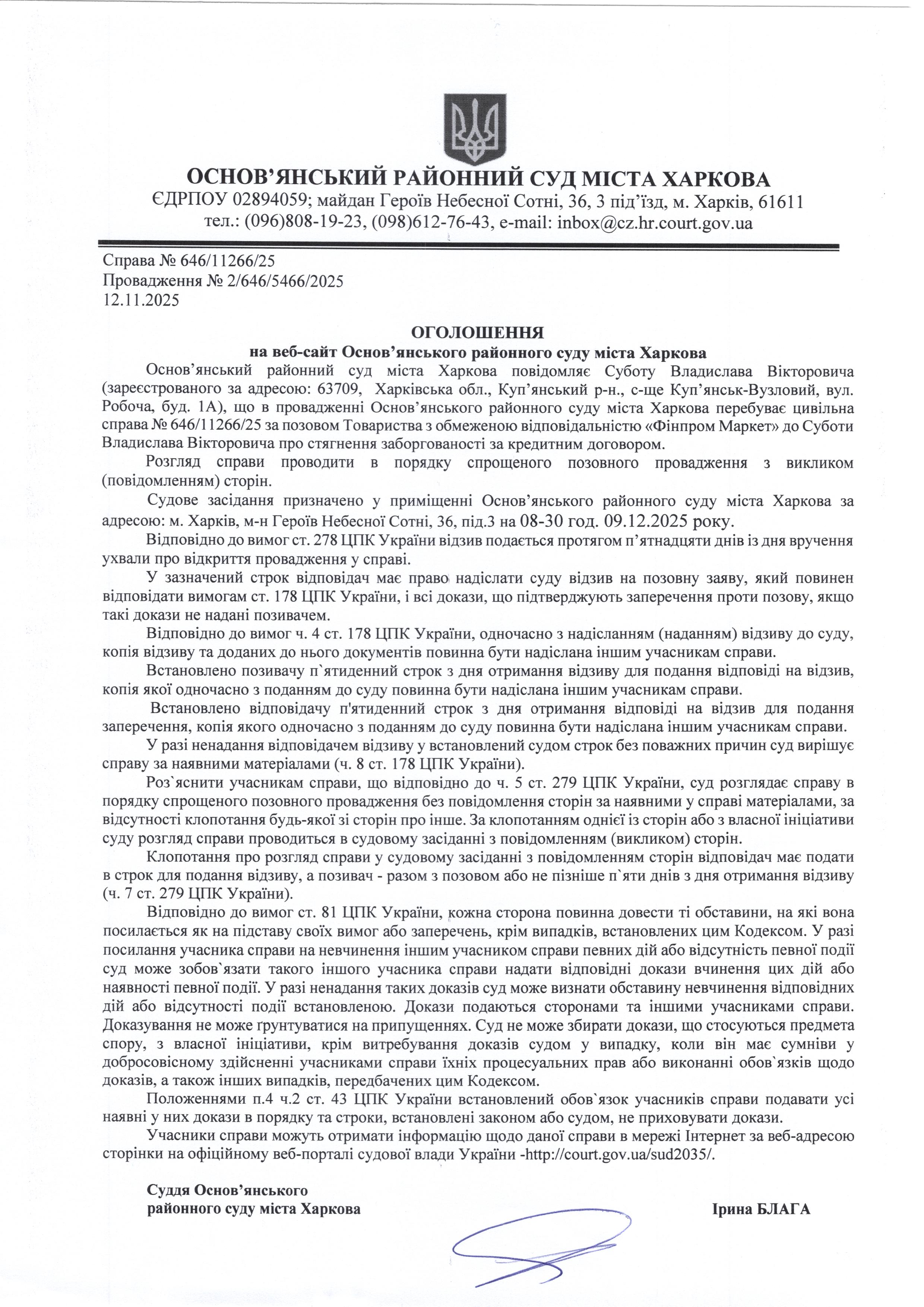 Оголошення по справі № 646/11266/25 для Суботи Владислава Вікторовича