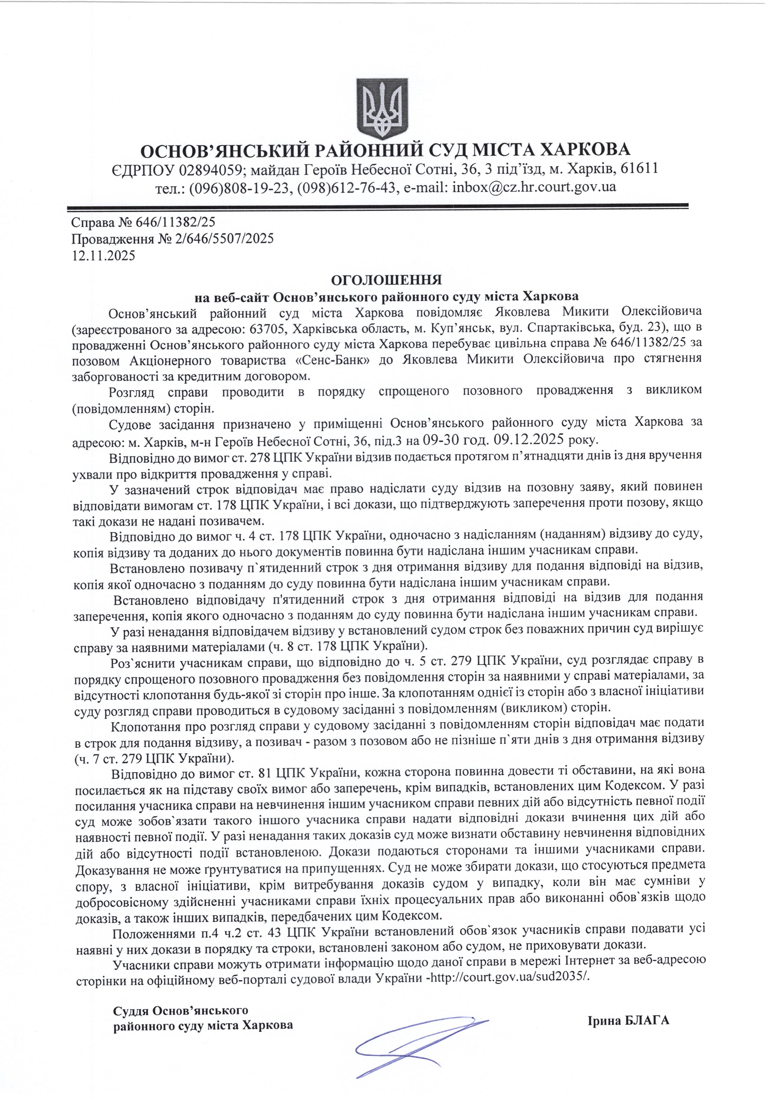 Оголошення по справі № 646/11382/25 для Яковлева Микити Олексійовича