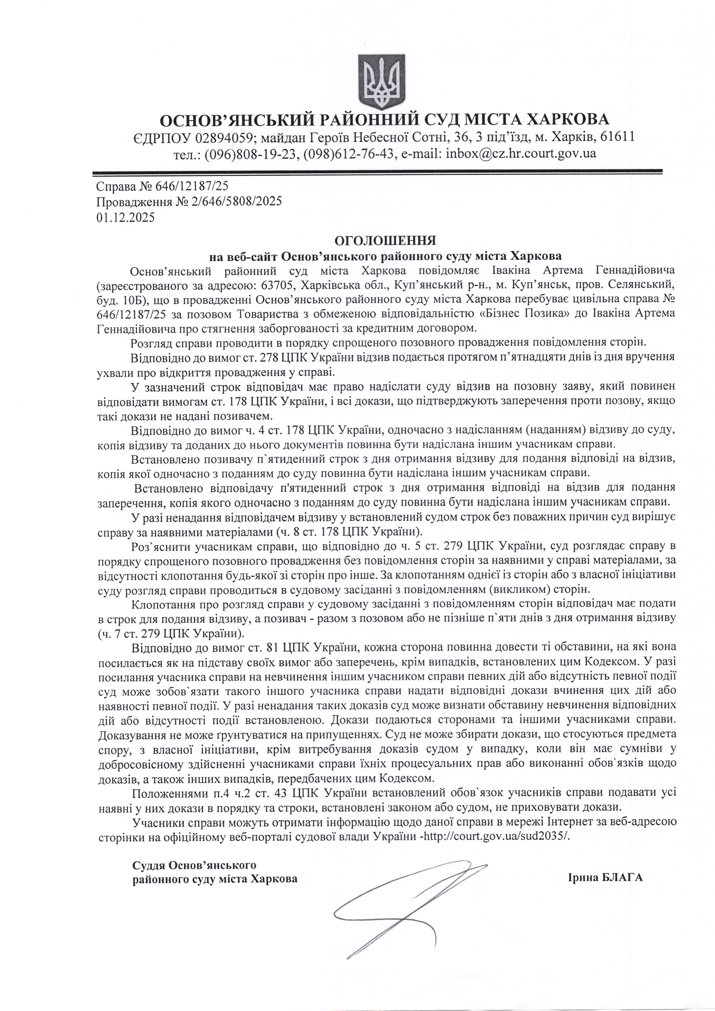 Оголошення по справі № 646/12187/25 для Івакіна Артема Геннадійовича