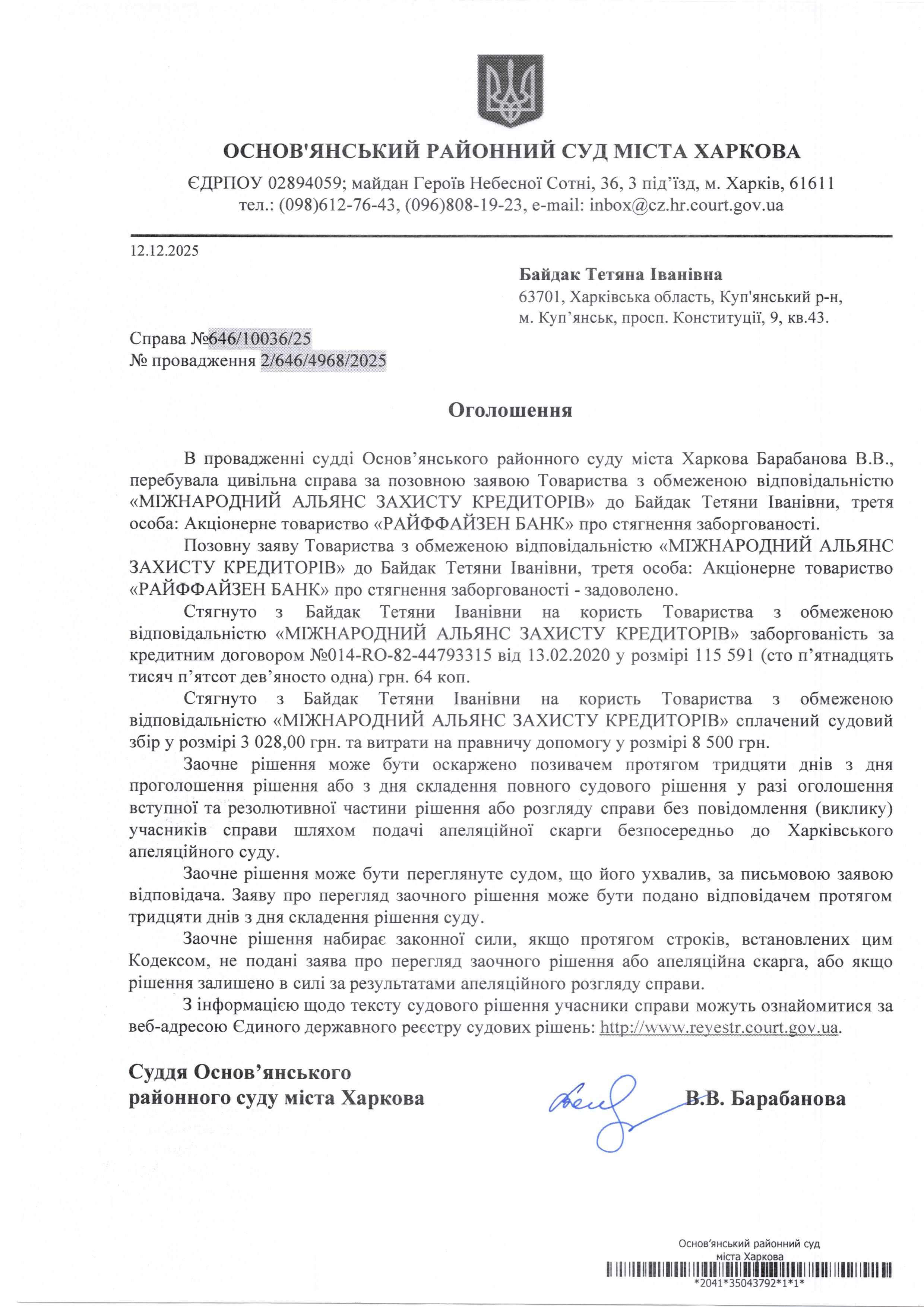 Оголошення по справі № 646/10036/25 для Байдак Тетяни Іванівни
