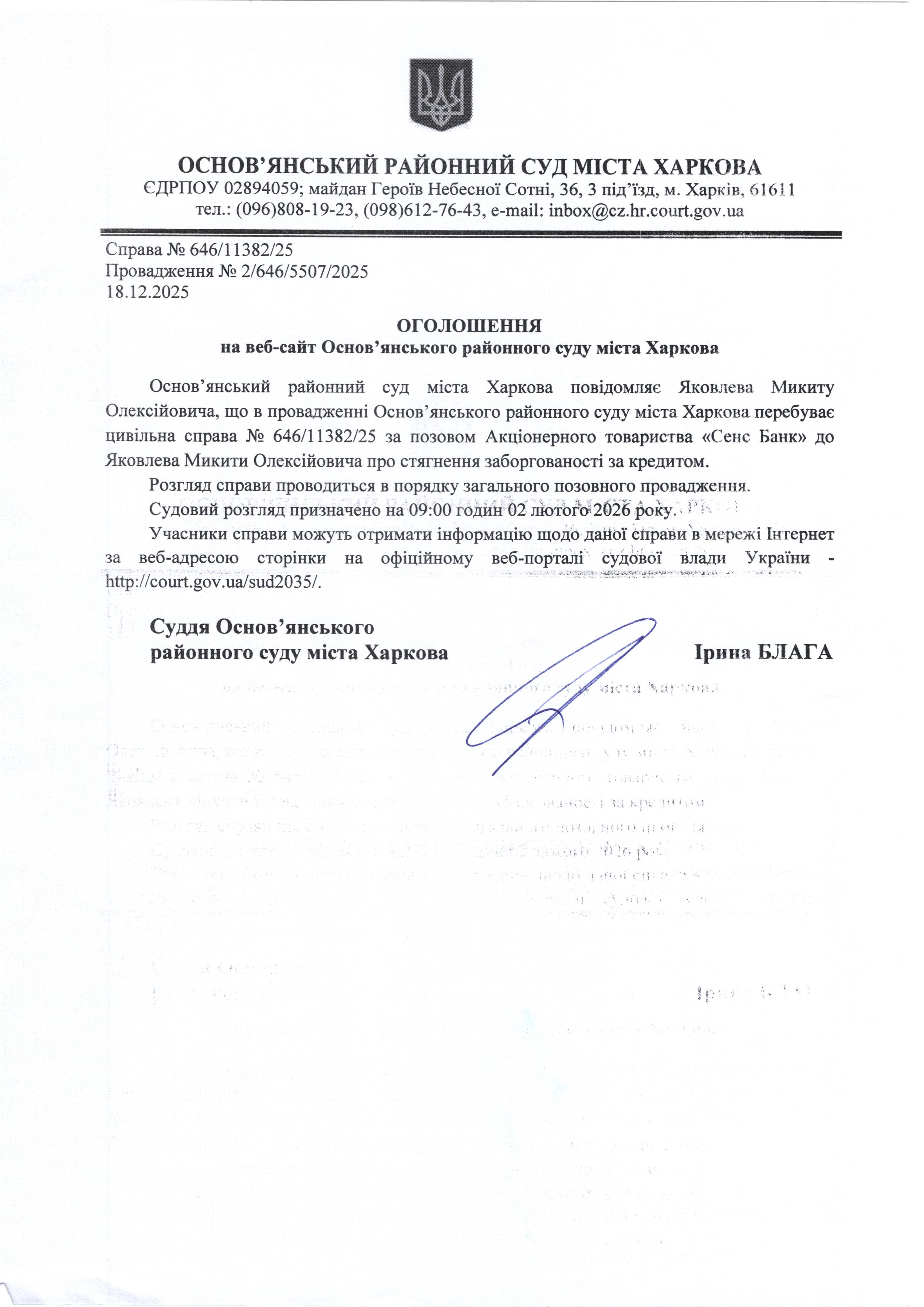 Оголошення по справі № 646/11382/25 для Яковлева Микити Олексійовича