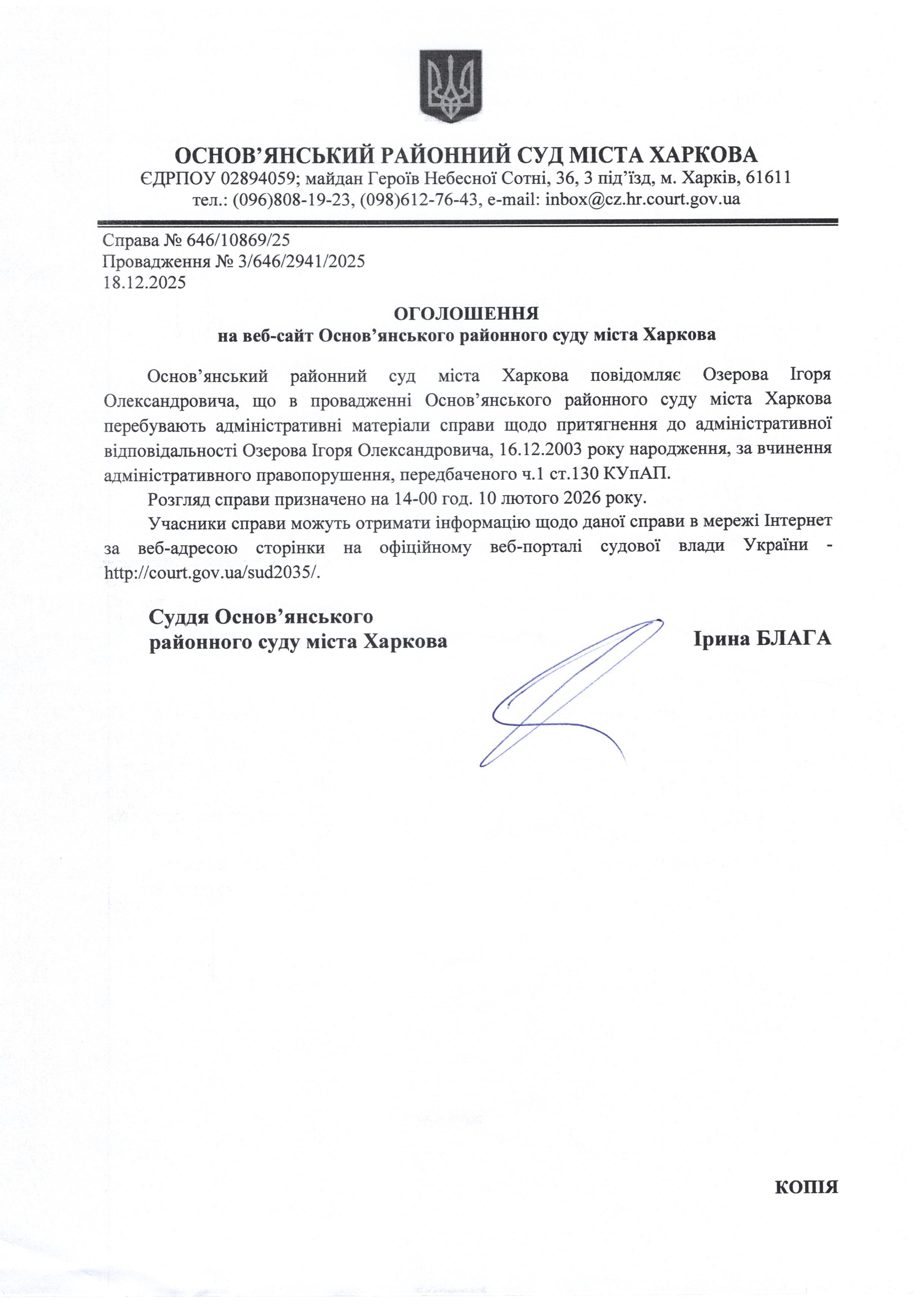 Оголошення по справі № 646/10869/25 для Озерова Ігоря Олександровича