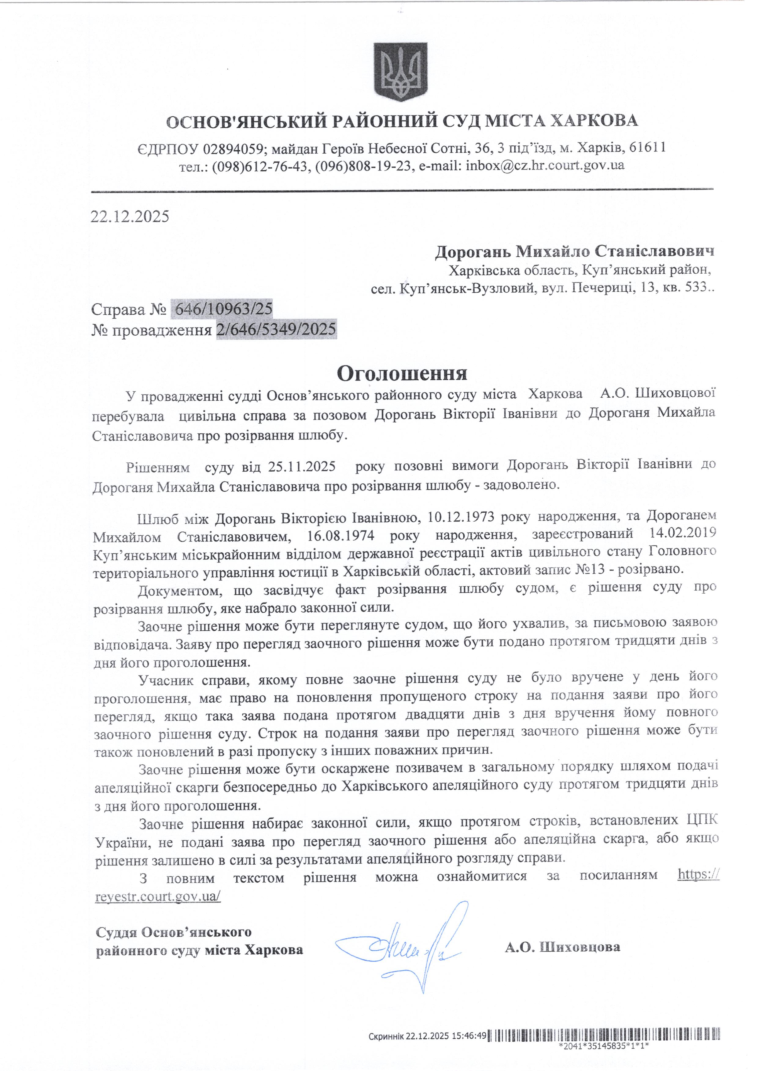 Оголошення по справі № 646/10963/25 для Дорогань Михайла Станіславовича