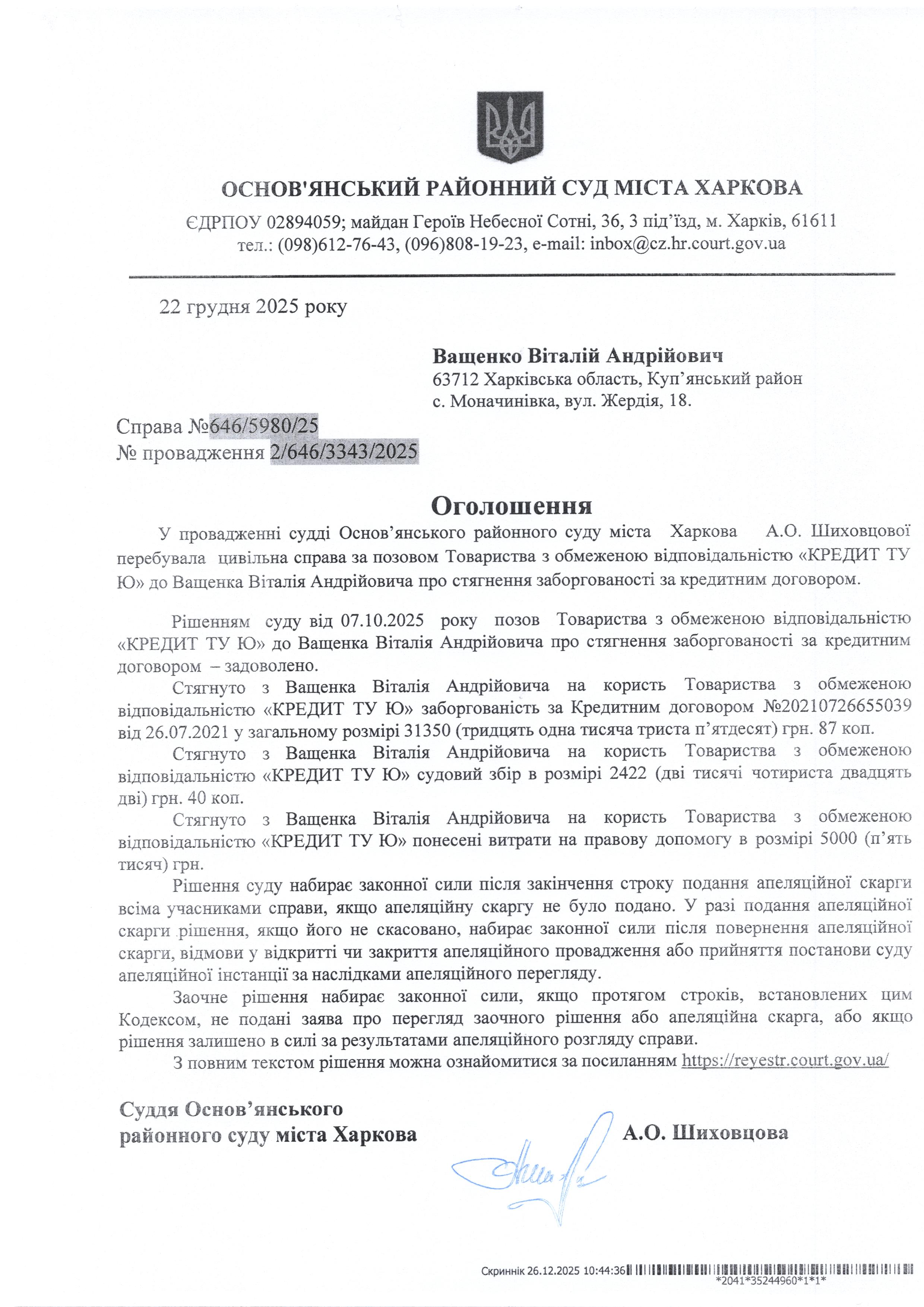 Оголошення по справі № 646/5980/25 для Ващенка Віталія Андрійовича