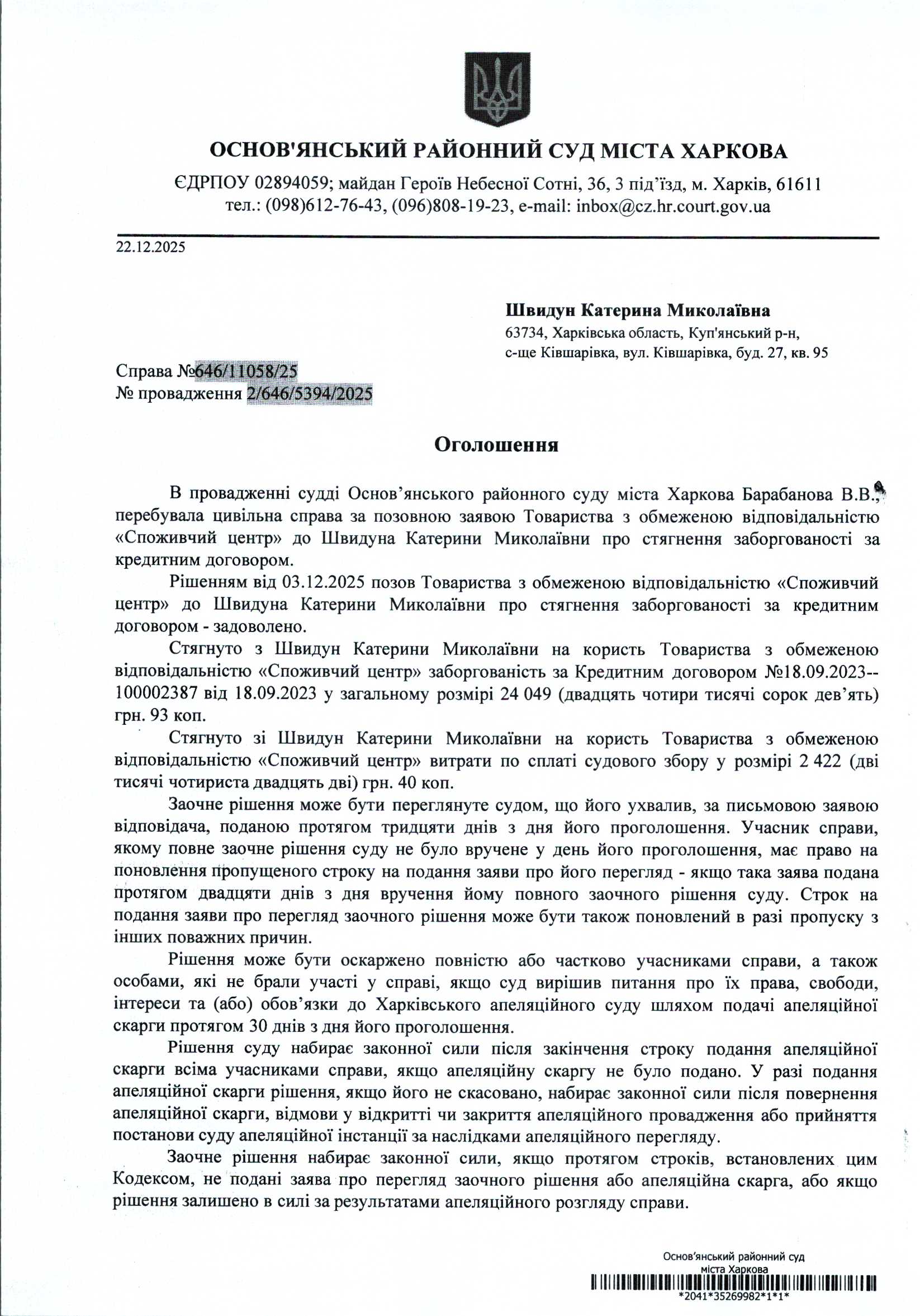Оголошення по справі № 646/11058/25 для Швидун Катерини Миколаївни