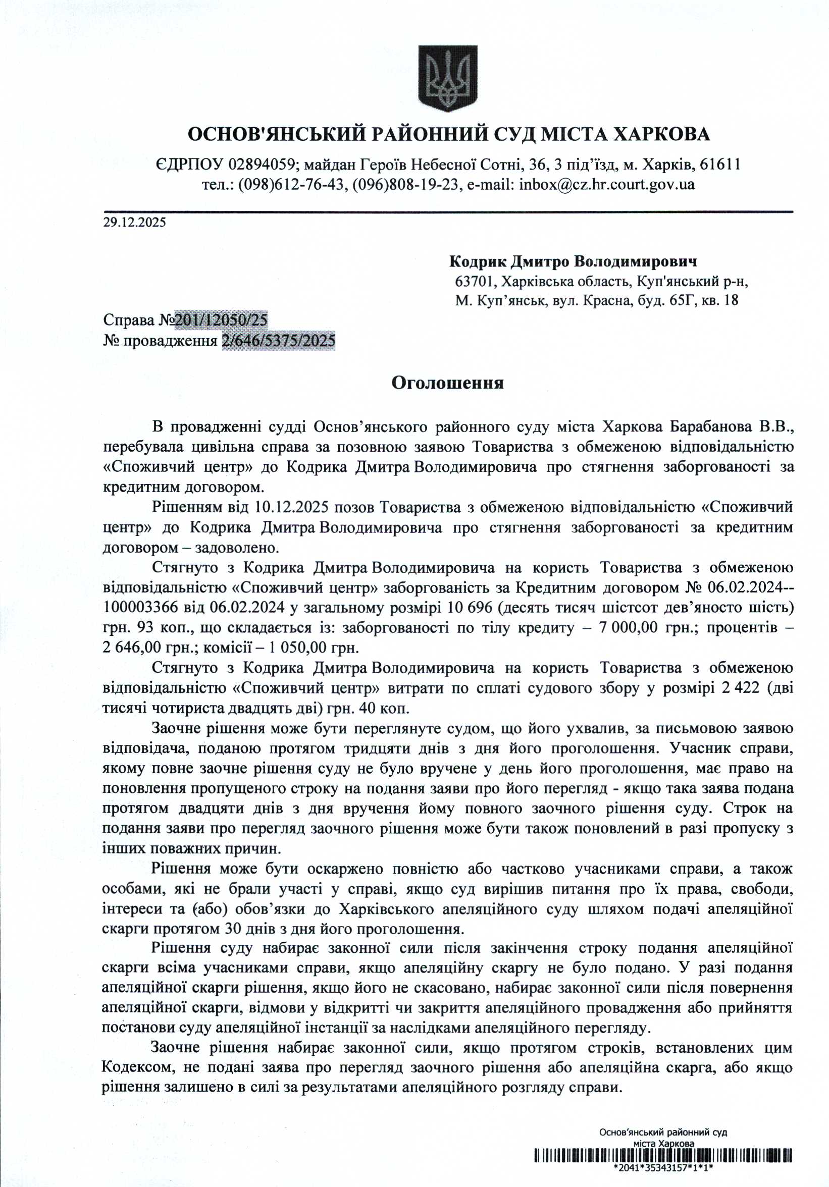 Оголошення по справі № 201/12050/25 для Кодрик Дмитра Володимировича
