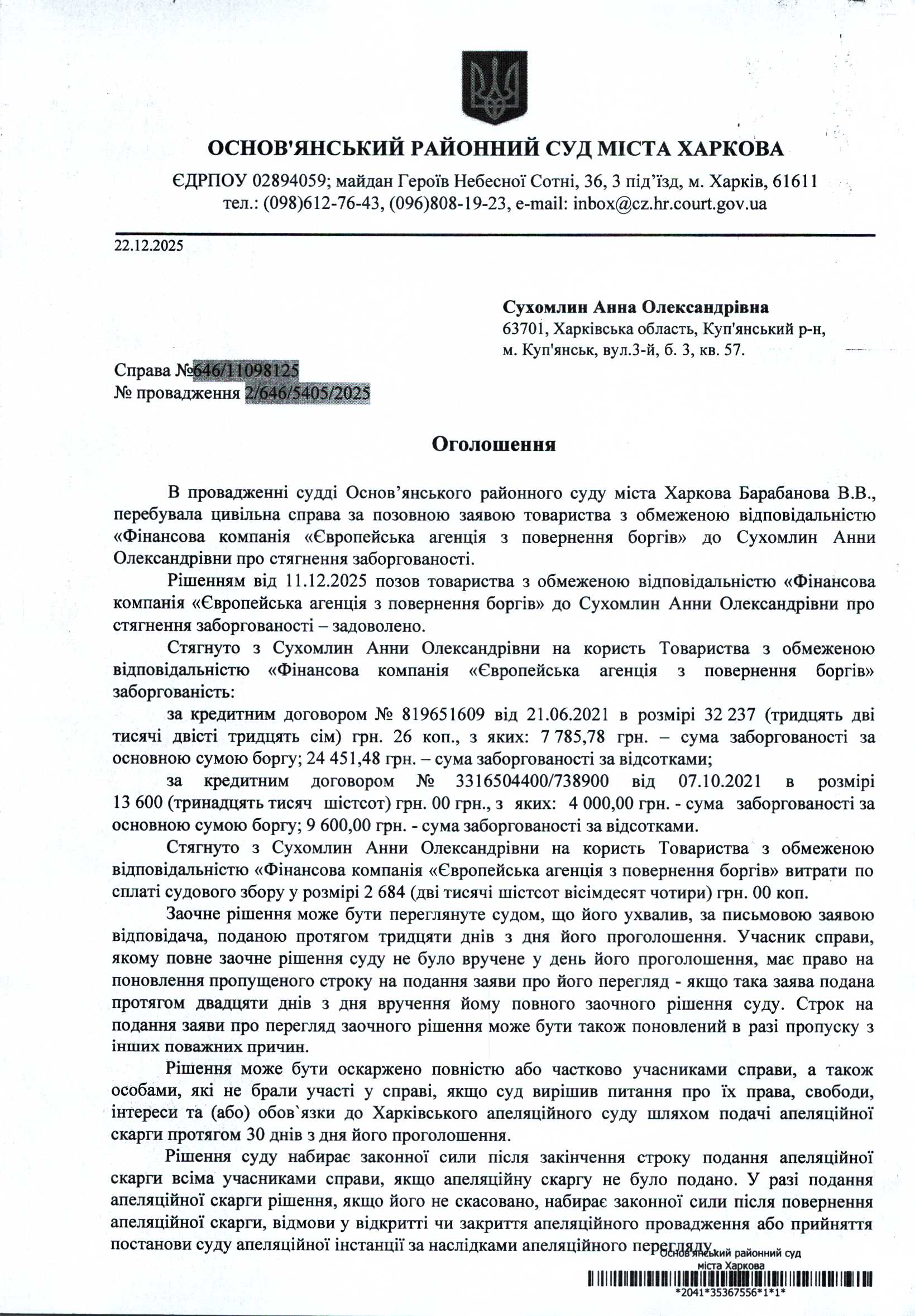 Оголошення по справі № 646/11098/25 для Сухомлин Анни Олександрівни