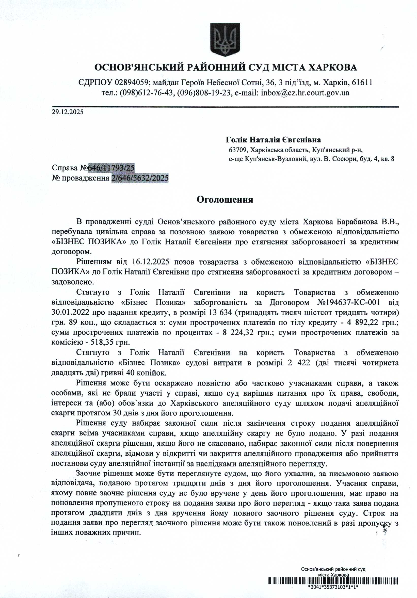 Оголошення по справі № 646/11793/25 для Голік Наталії Євгенівни
