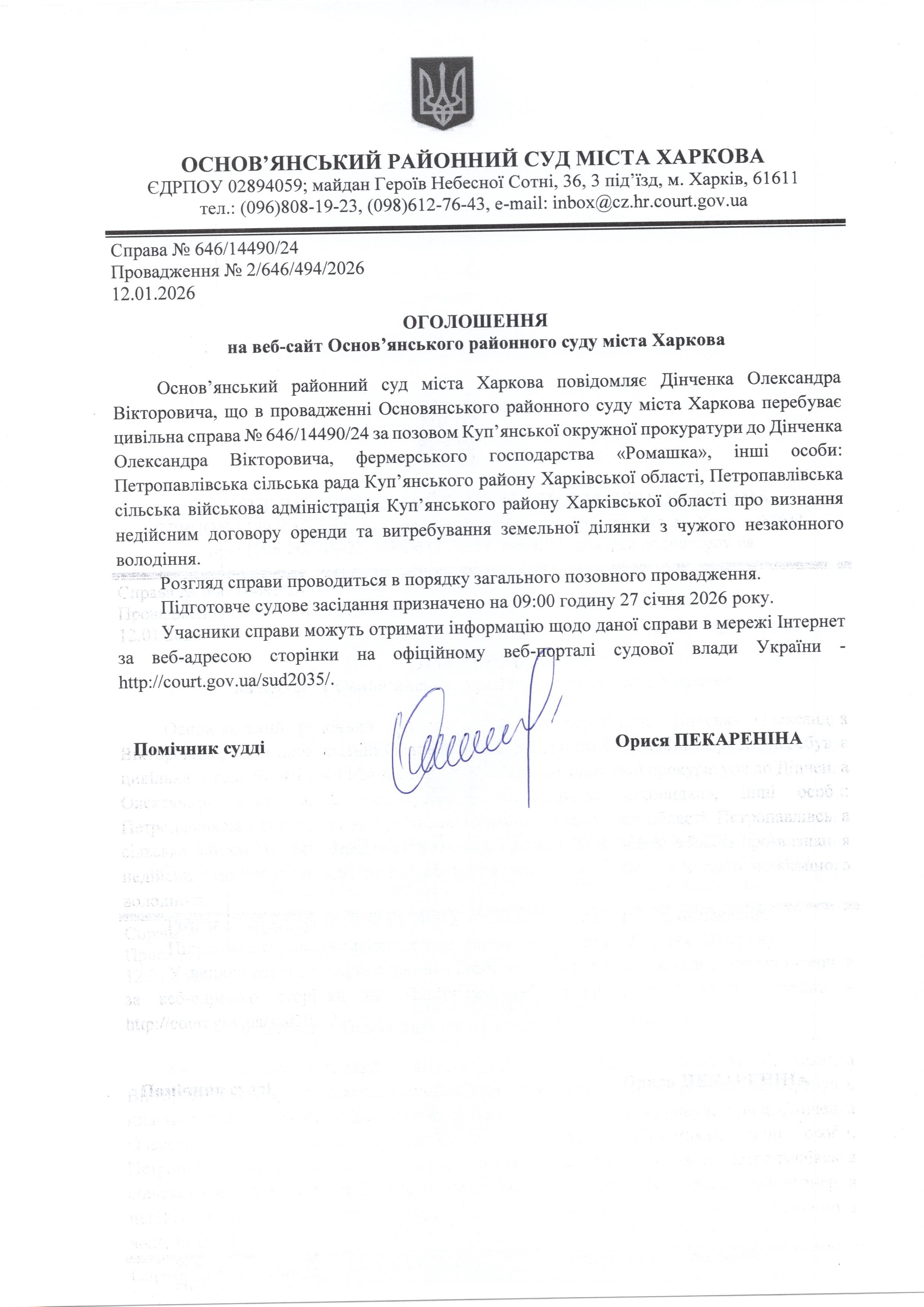 Оголошення по справі № 646/14490/24 для Дінченка Олександра Вікторовича