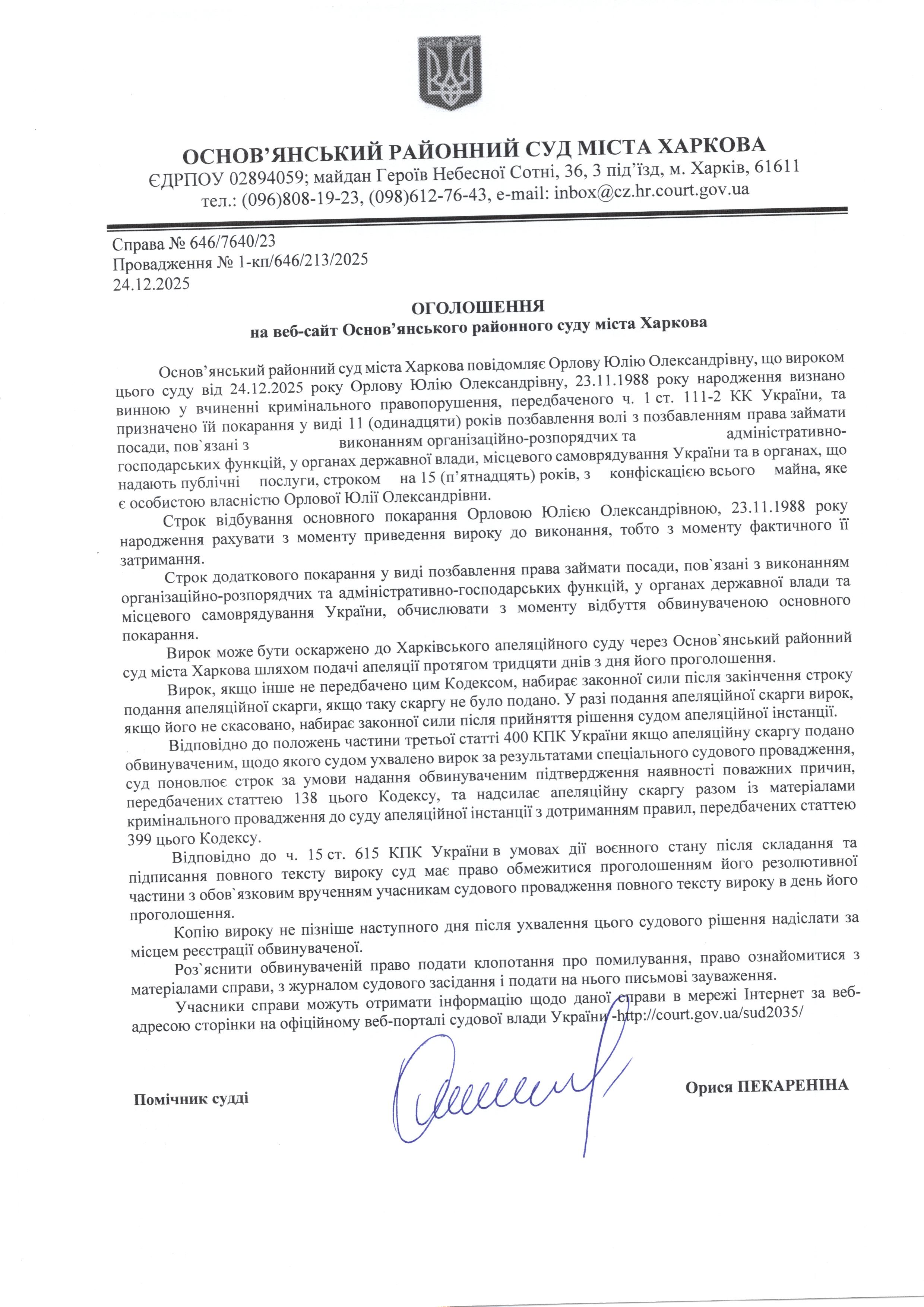 Оголошення по справі № 646/7640/23 для Орлової Юлії Олександрівни