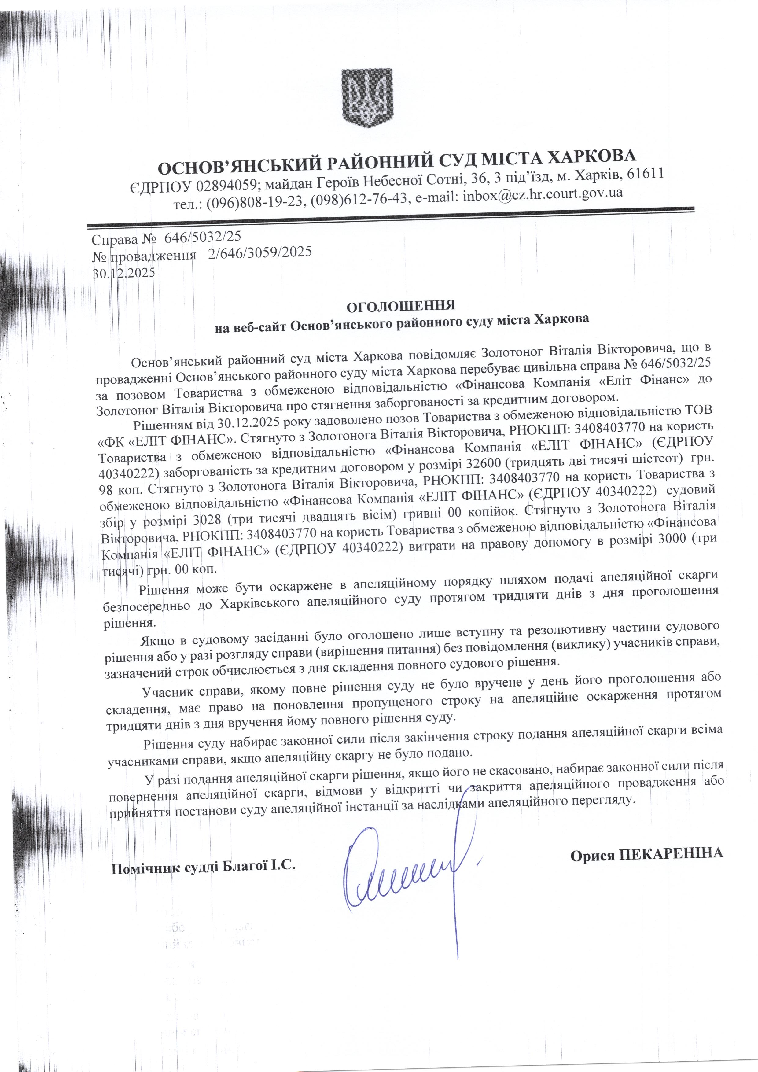 Оголошення по справі № 646/5032/25 для Золотоног Віталія Вікторовича