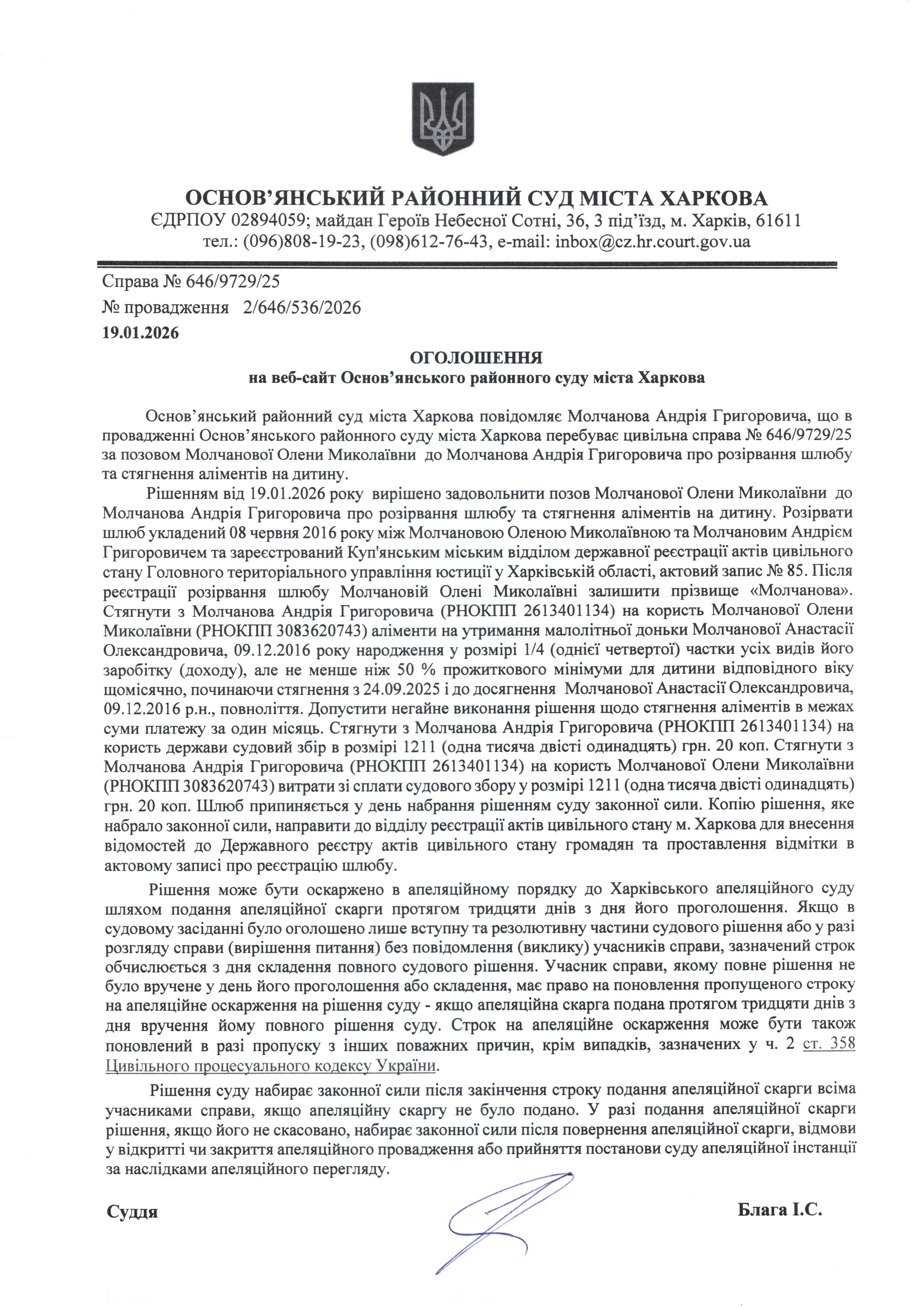 Оголошення по справі № 646/9729/25 для Молчанова Андрія Григоровича