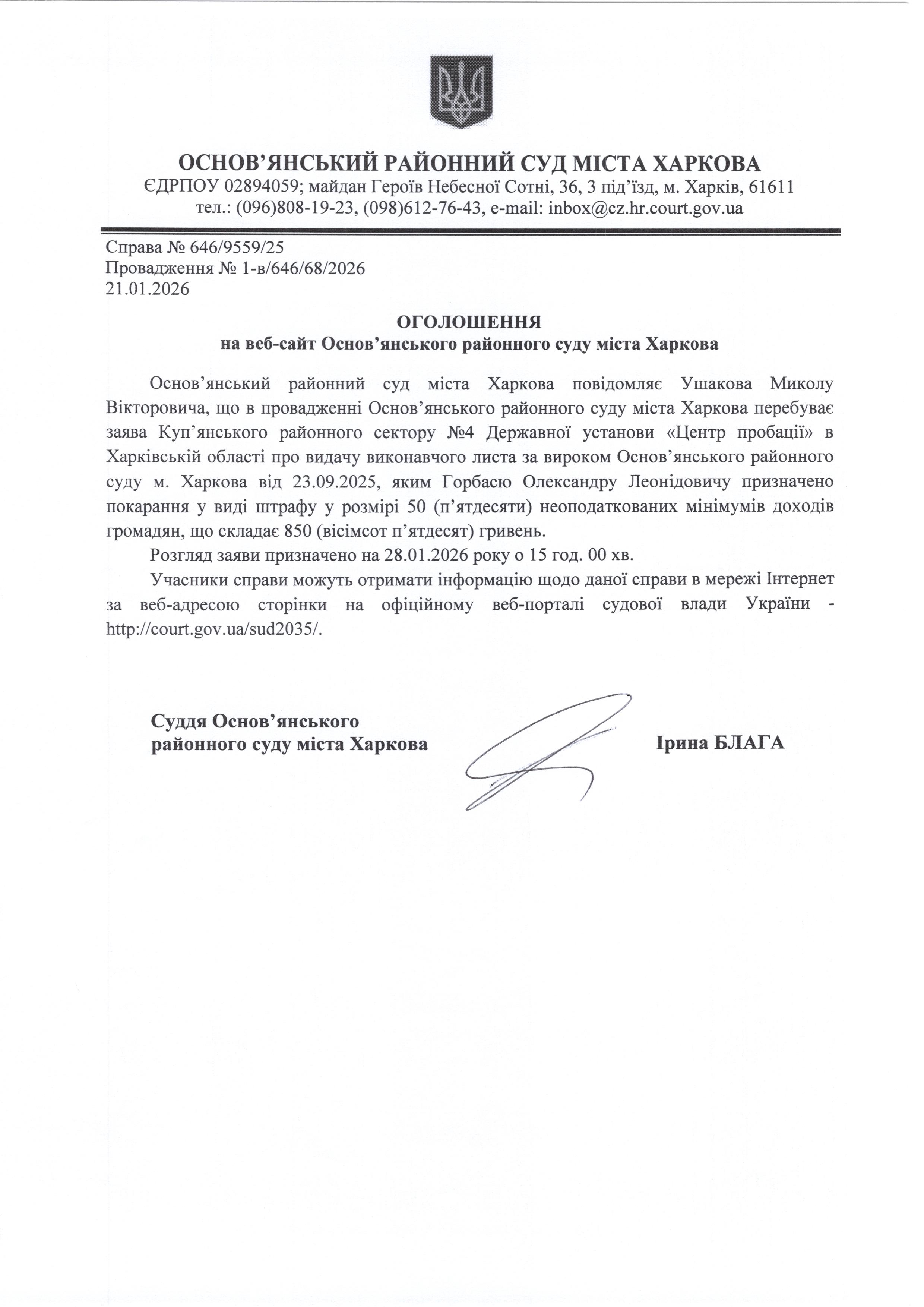 Оголошення по справі № 646/9559/25 для Ушакова Миколи Вікторовича