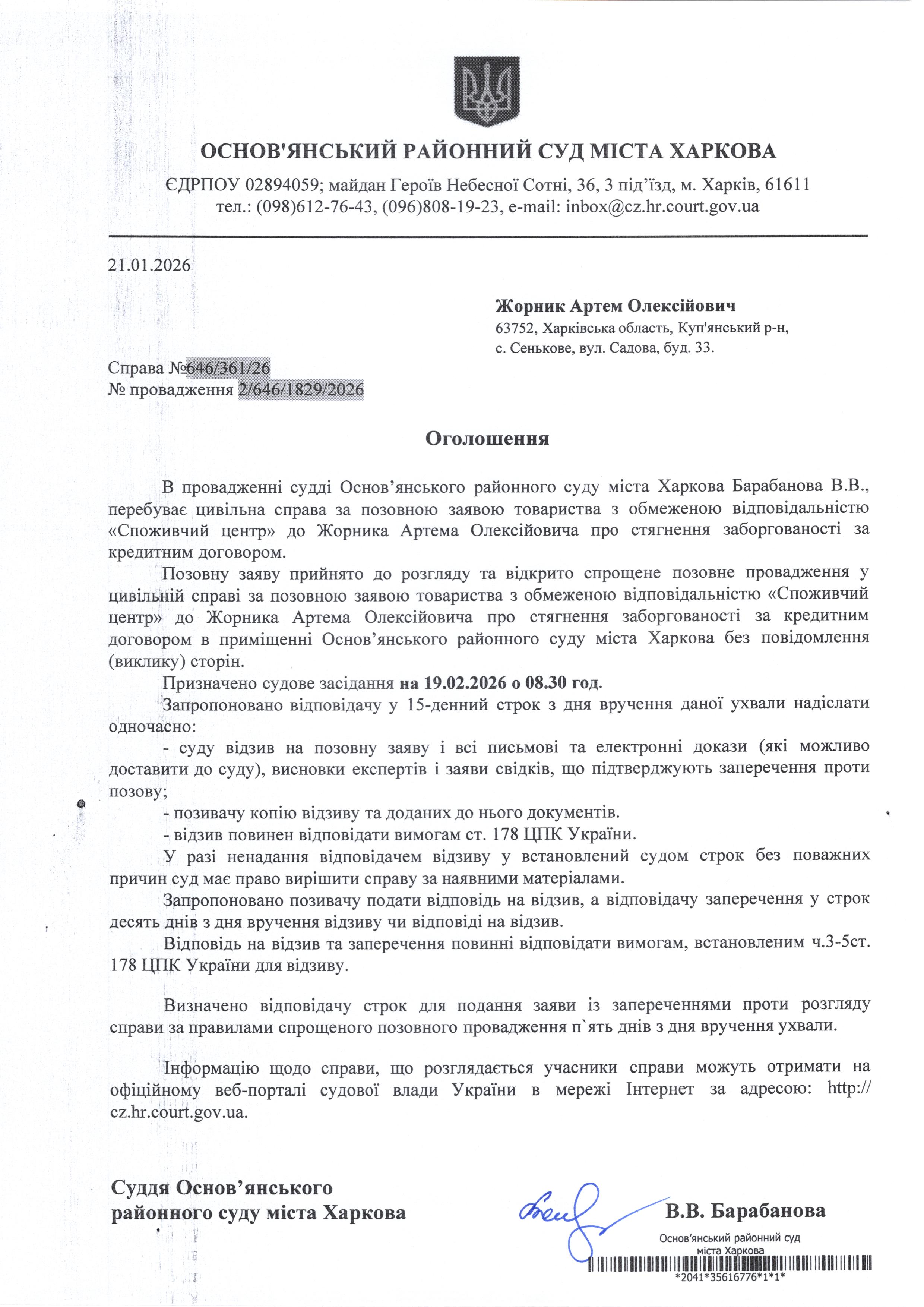 Оголошення по справі № 646/361/26 для Жорник Артема Олексійовича
