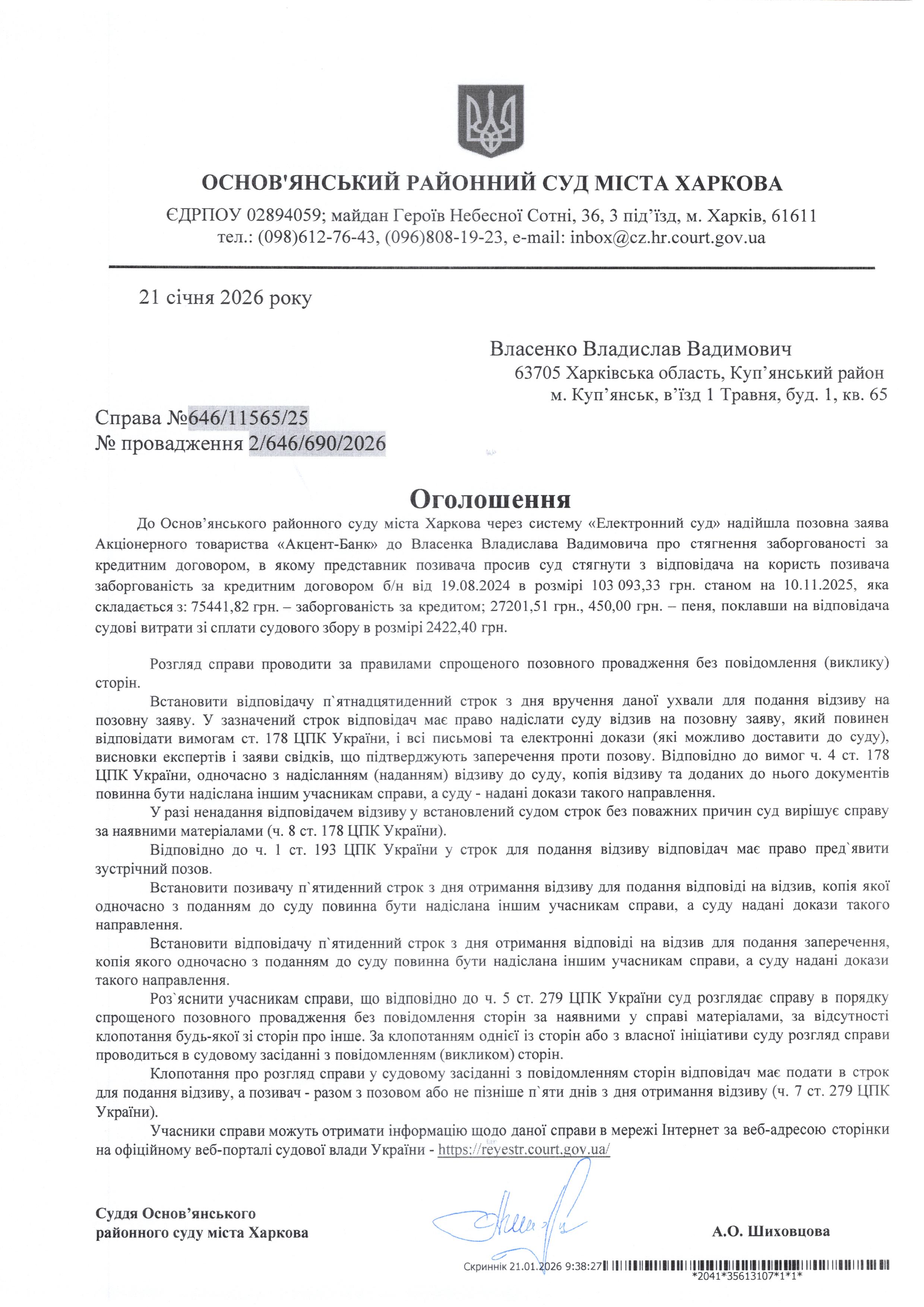 Оголошення по справі № 646/11565/25 для Власенка Владислава Вадимовича