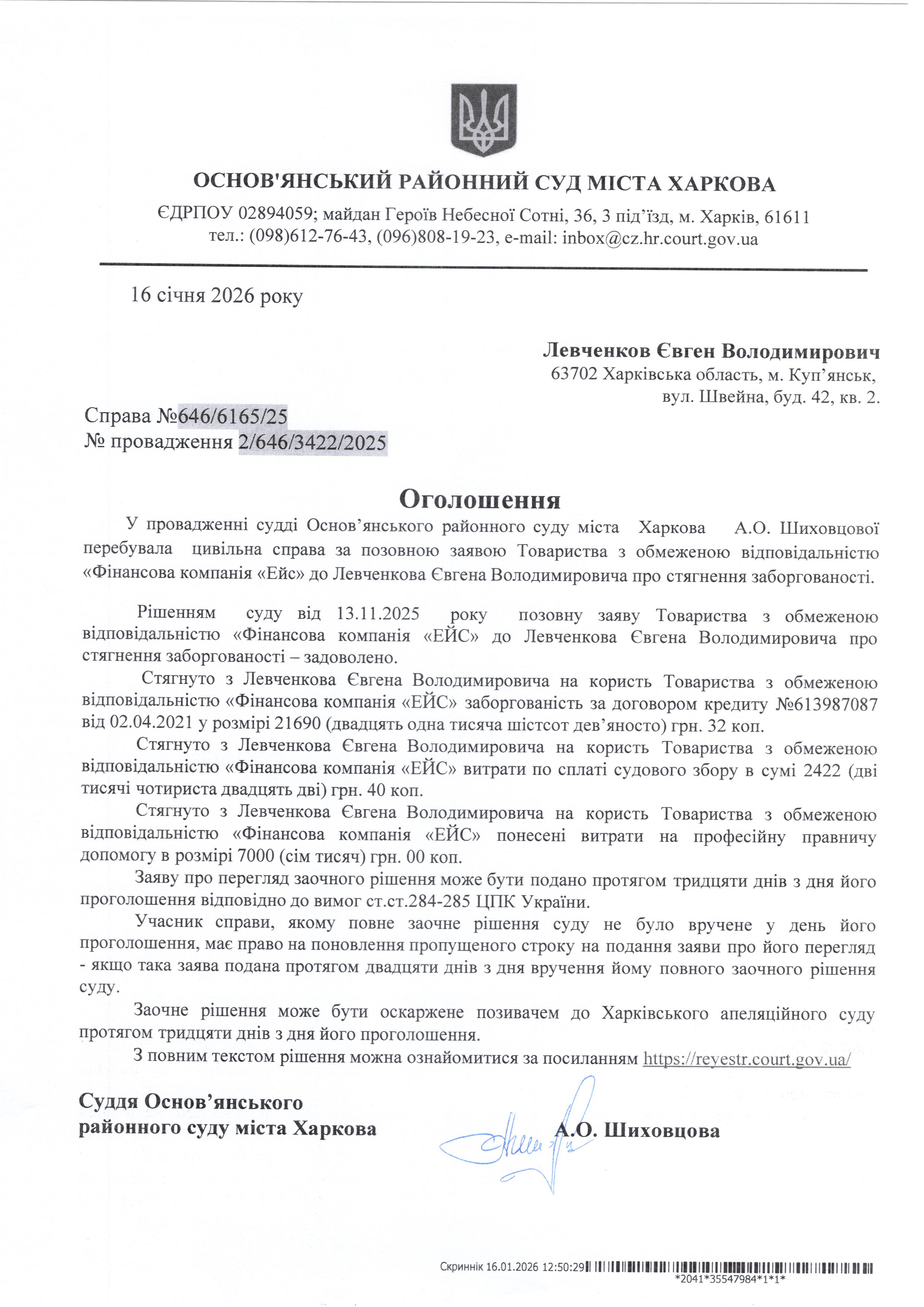 Оголошення по справі № 646/6165/25 для Левченкова Євгена Володимировича
