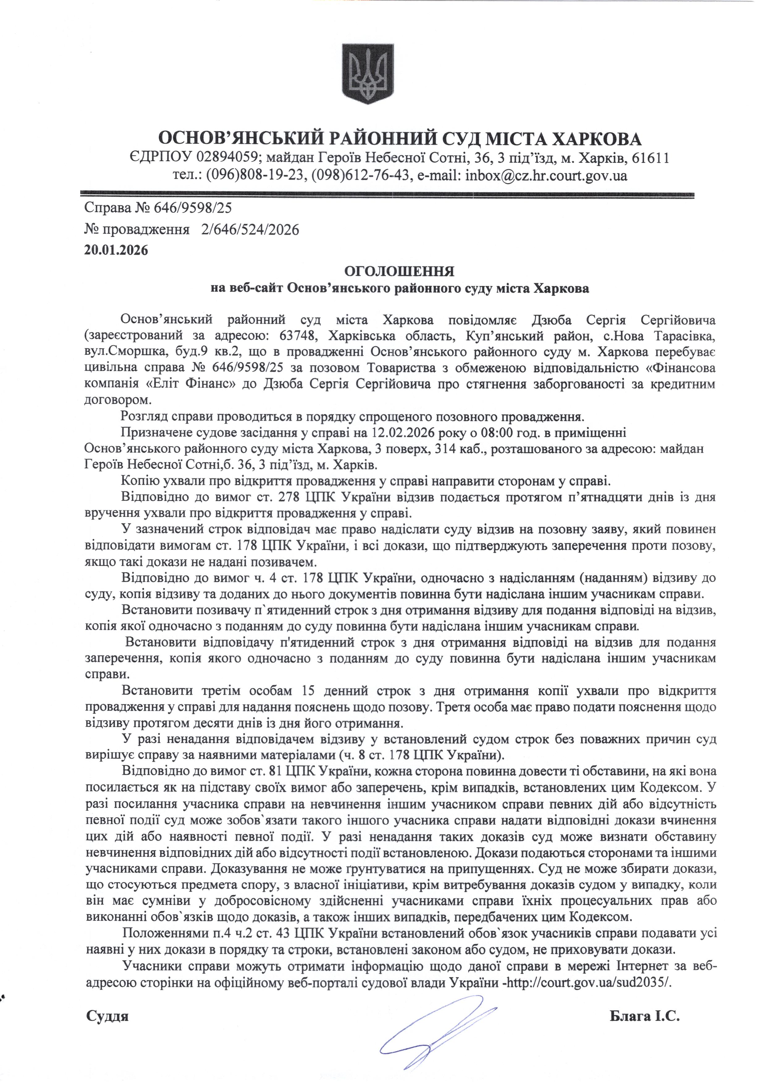 Оголошення по справі № 646/9598/25 для Дзюби Сергія Сергійовича