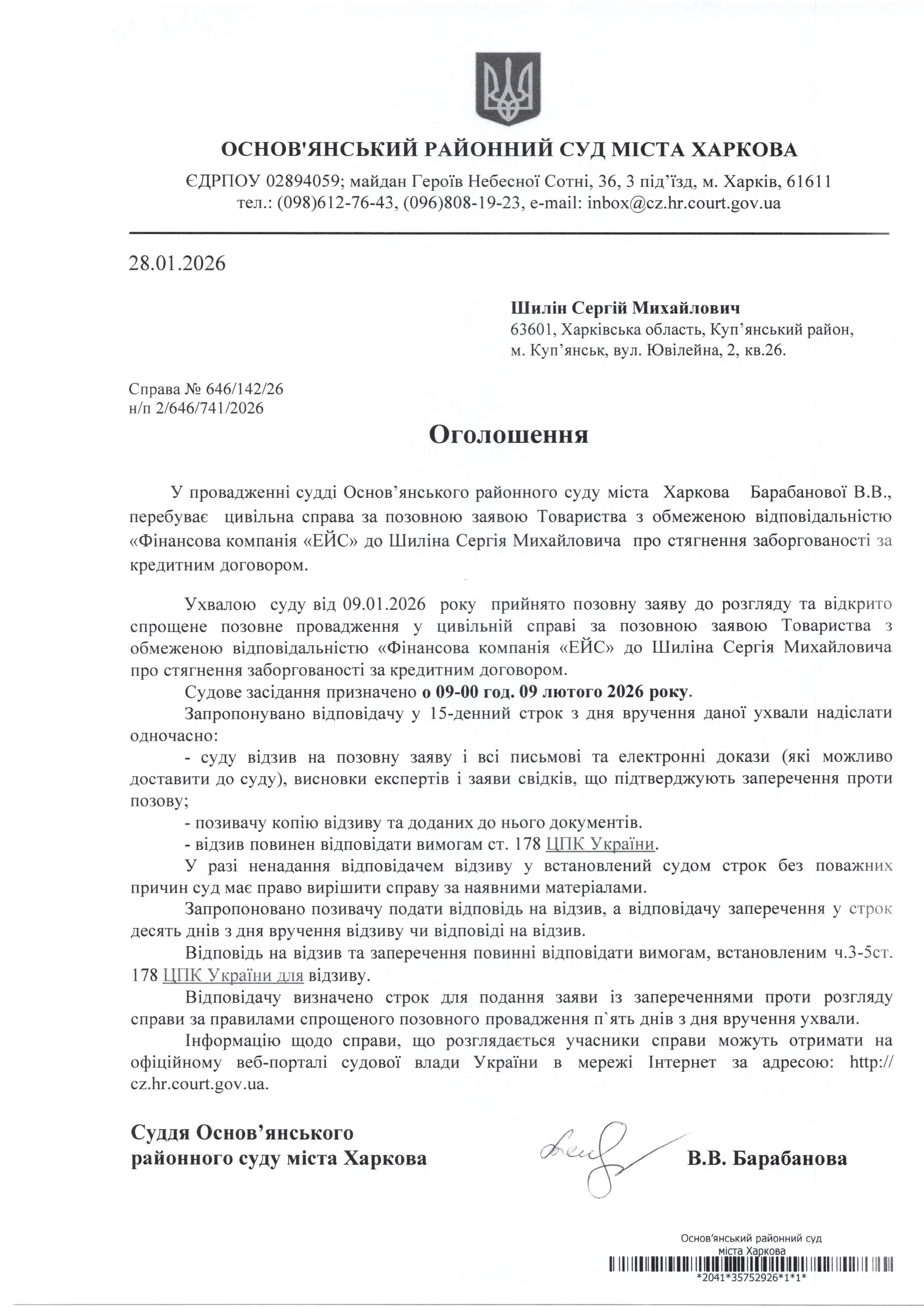 Оголошення по справі № 646/142/26 для Шиліна Сергія Михайловича