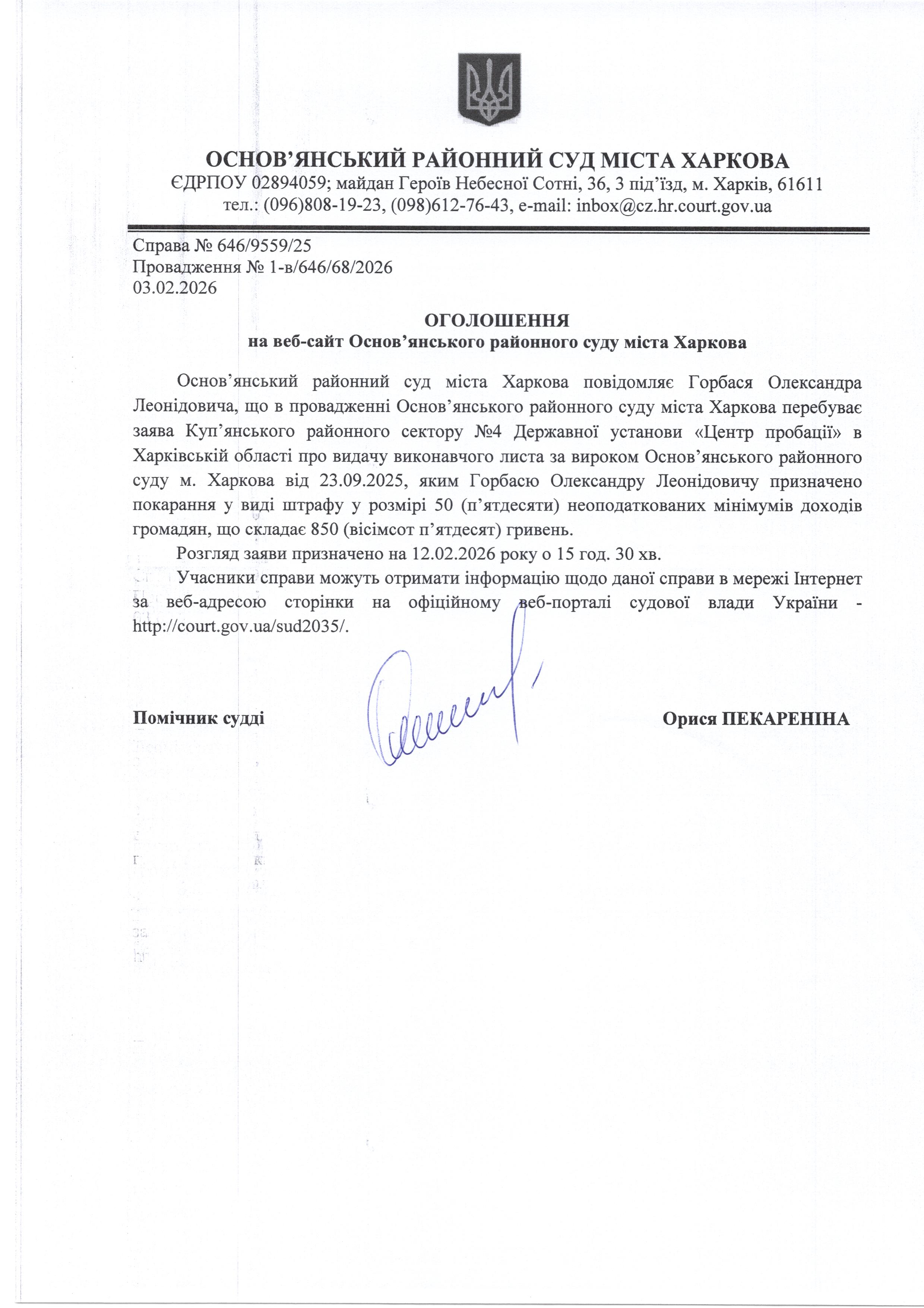 Оголошення по справі № 646/9559/25 для Горбася Олександра Леонідовича