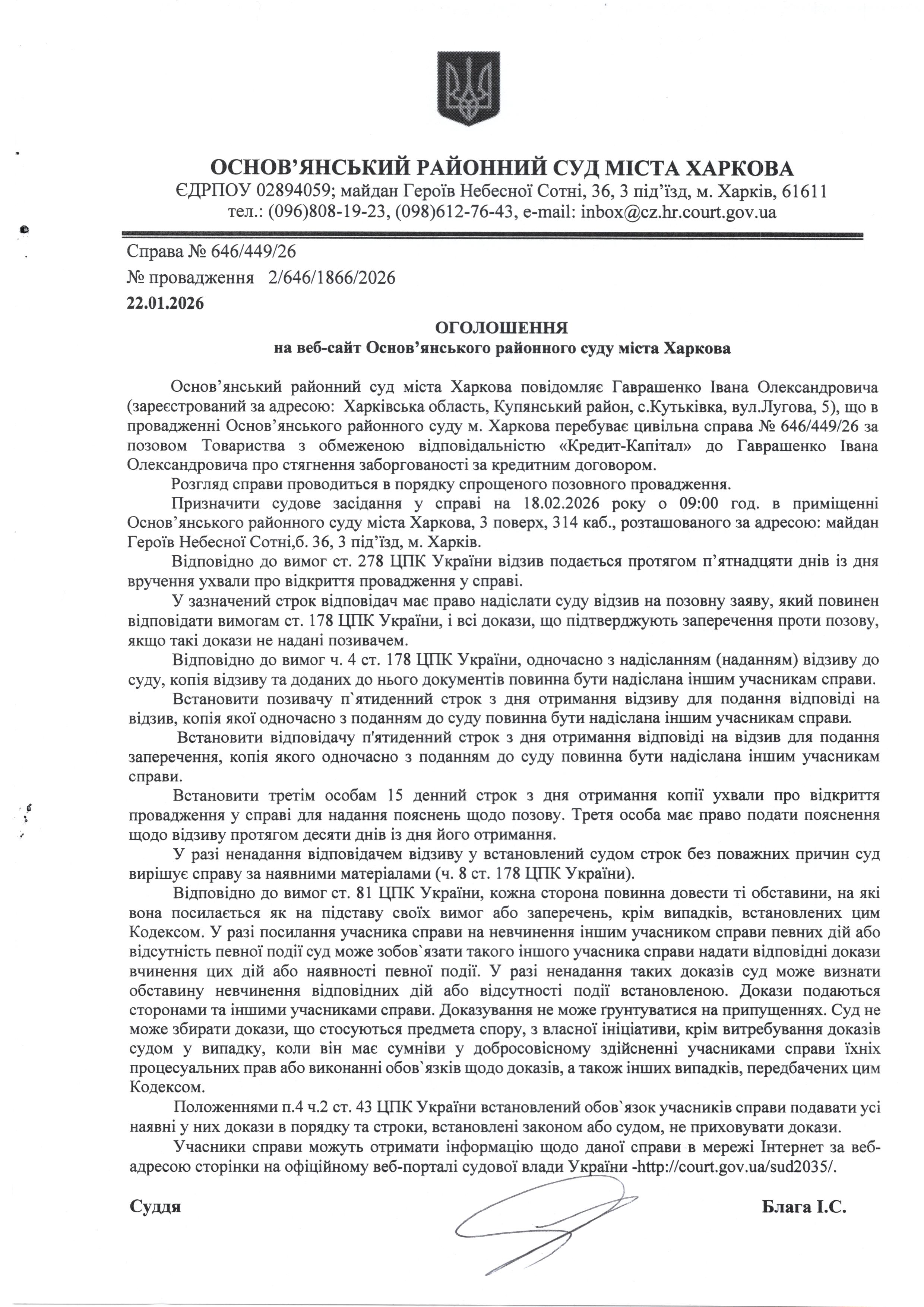 Оголошення по справі № 646/449/26 для Гаврашенка Івана Олександровича