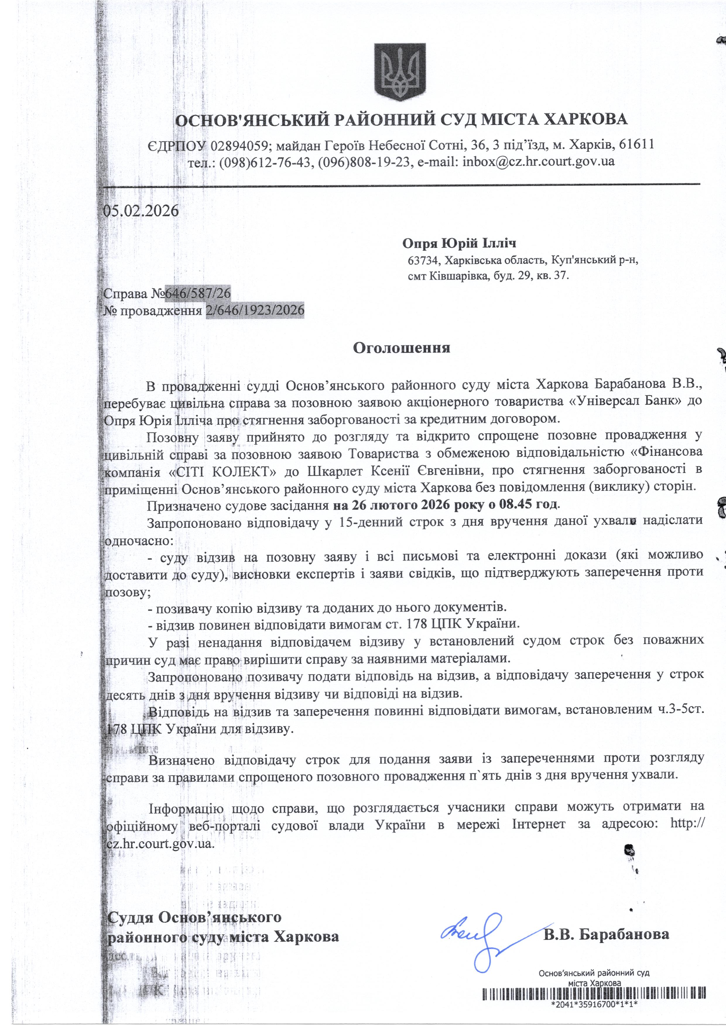 Оголошення по справі № 646/587/26 для Опря Юрія Ілліча