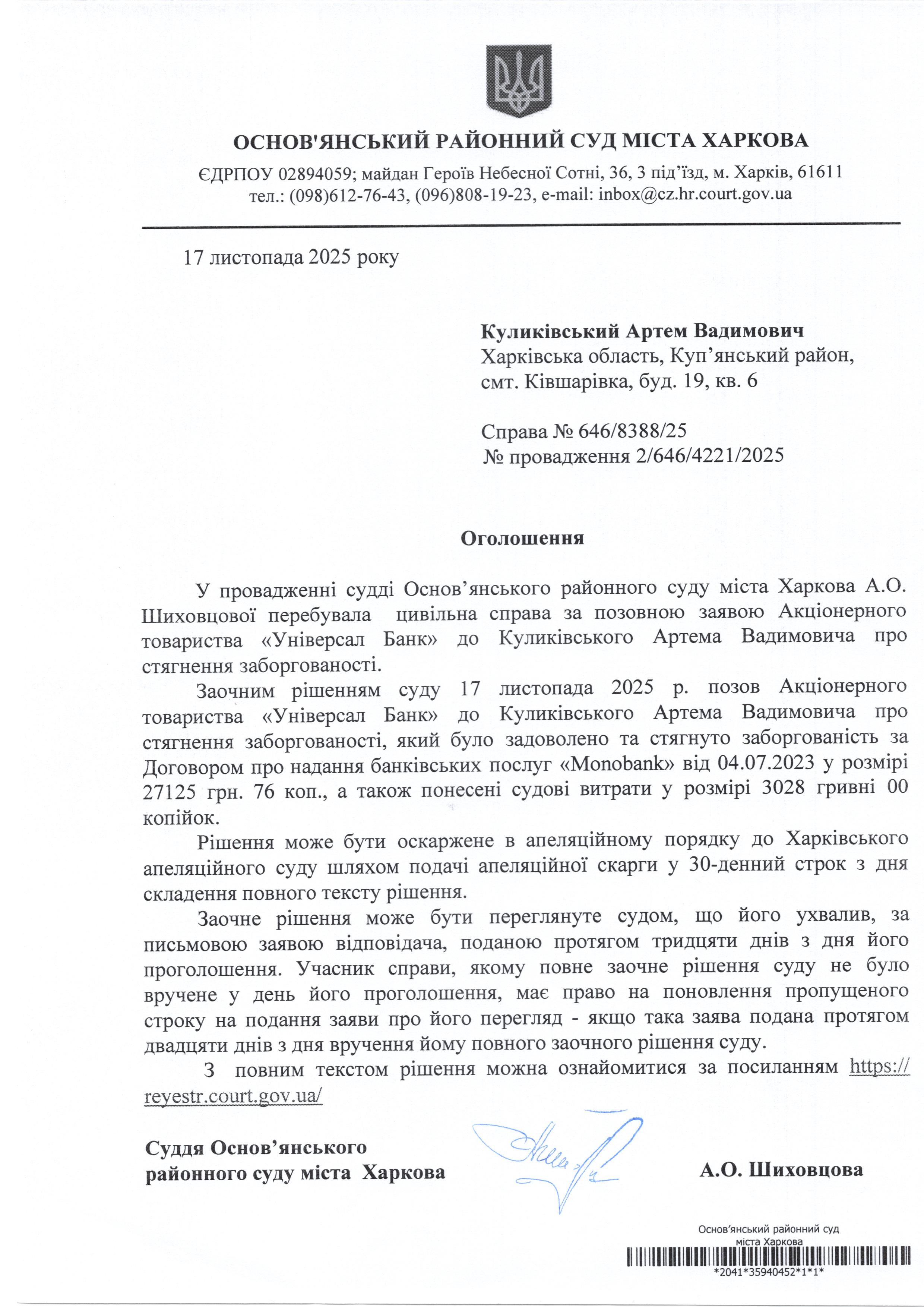 Оголошення по справі № 646/8388/25 для Куликівського Артема Вадимовича