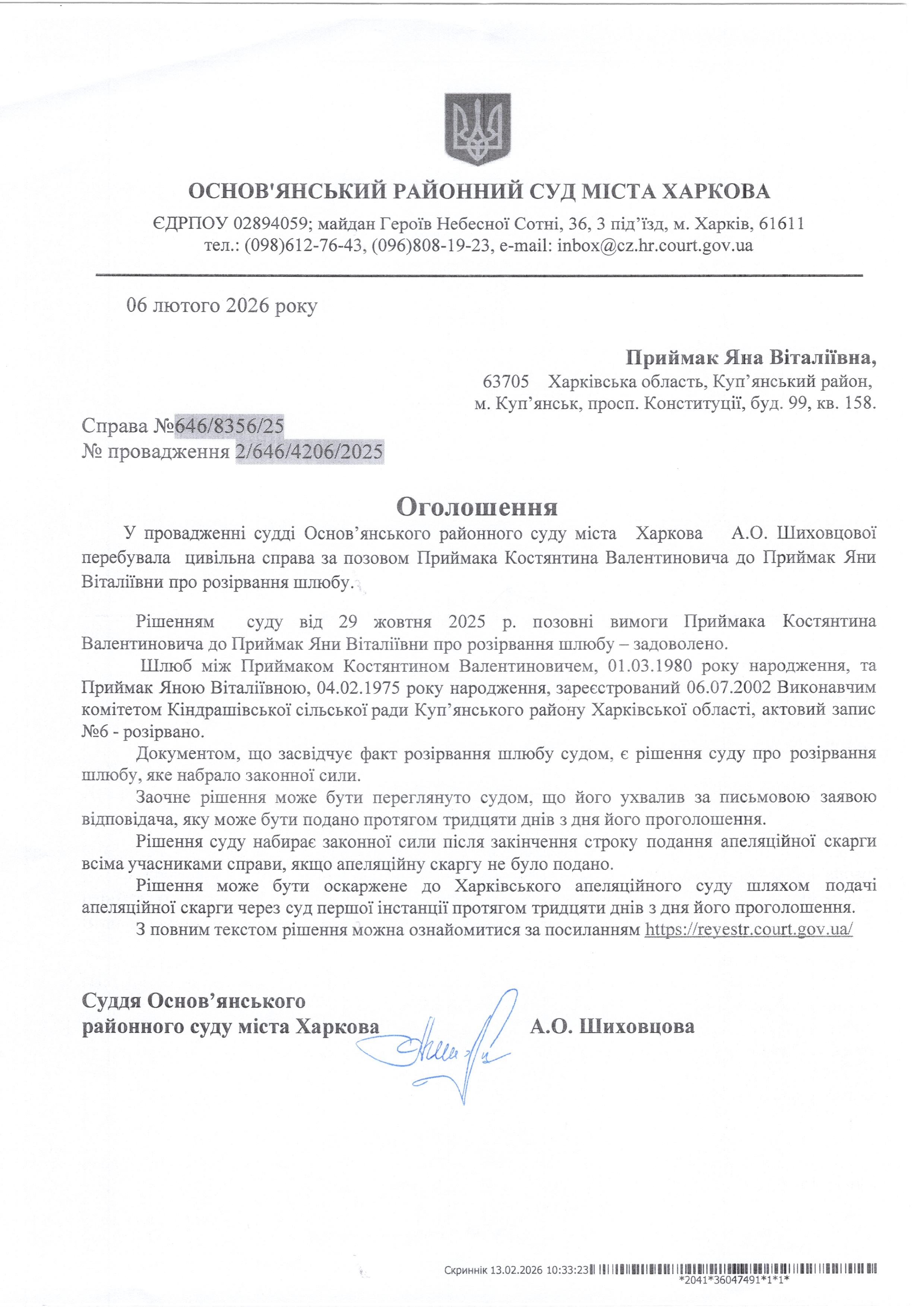 Оголошення по справі № 646/8356/25 для Приймак Яни Віталіївни