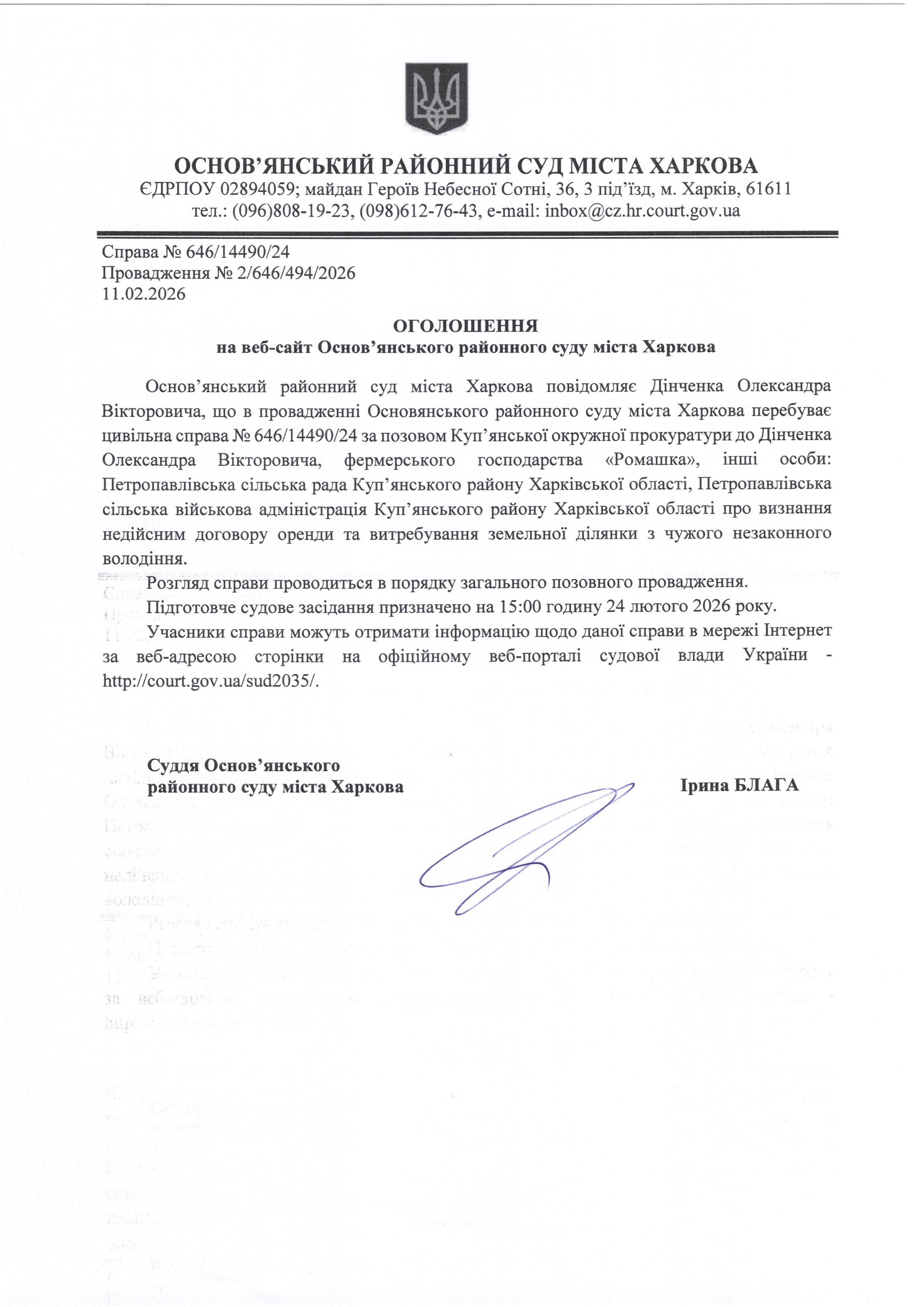 Оголошення по справі № 646/14490/24 для Дінченка Олександра Вікторовича
