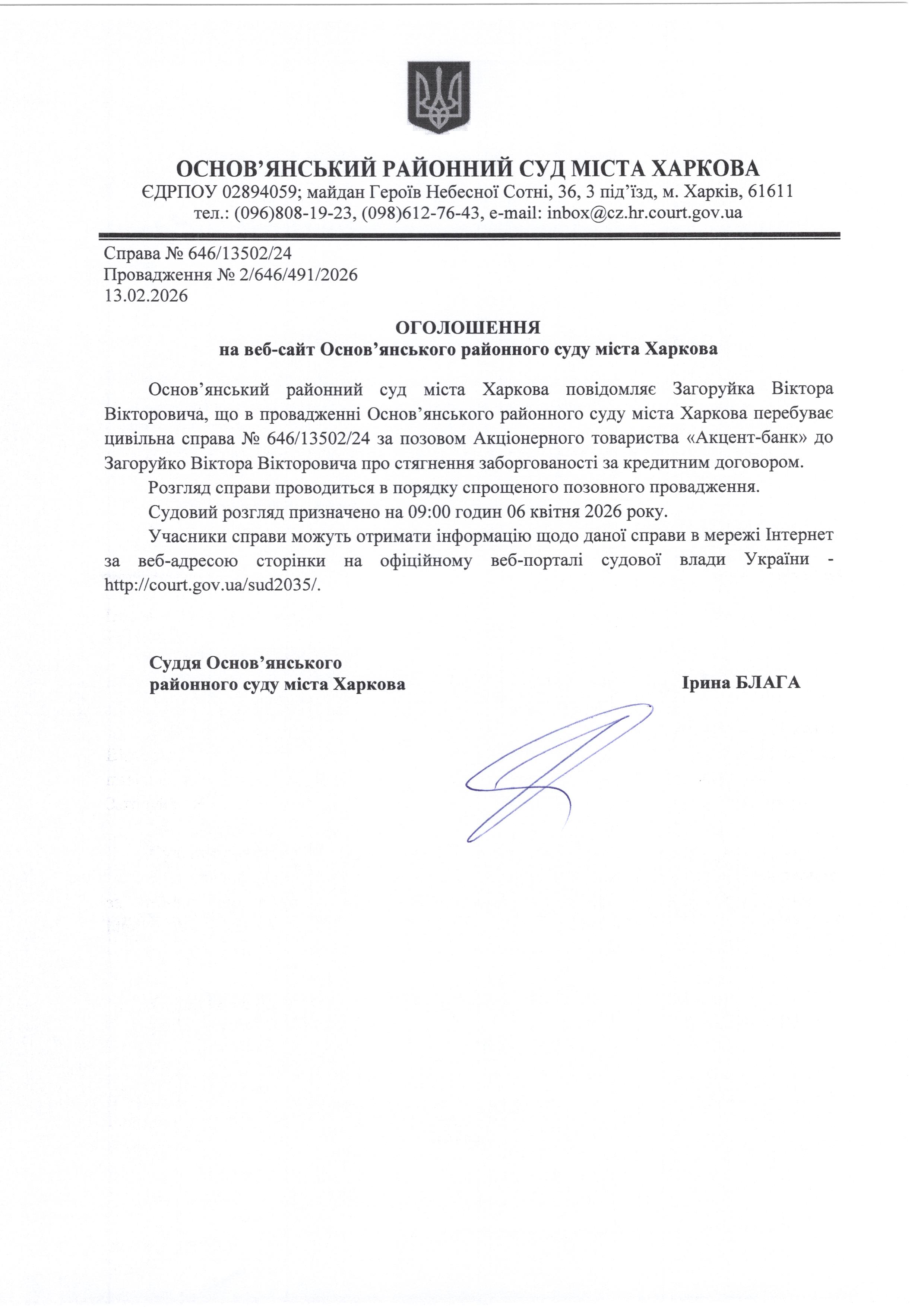 Оголошення по справі № 646/13502/24 для Загоруйка Віктора Вікторовича