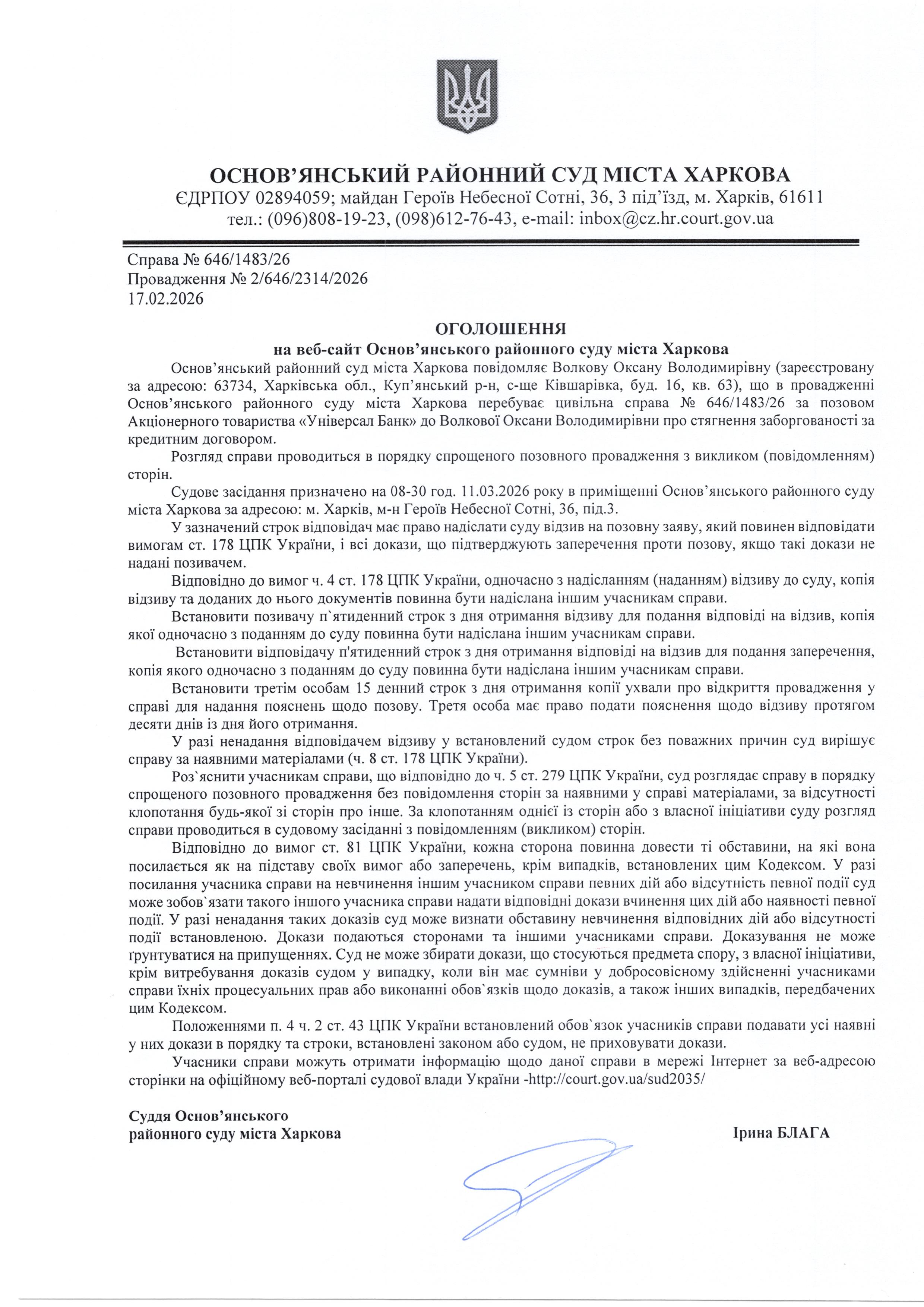 Оголошення по справі № 646/1483/26 для Волкової Оксани Володимирівни
